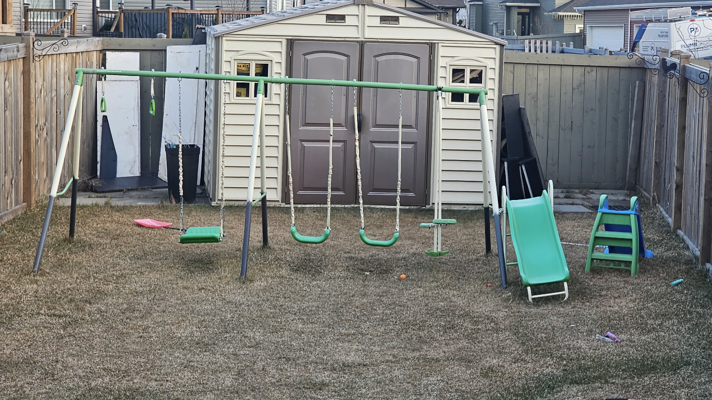 Used kids' playset. Includes two swings, a small slide, and a climbing step stool. Good condition, some minor wear. Perfect for backyard fun! Pick up southside of Edmonton.