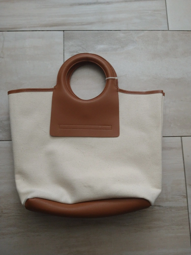 Stylish tote bag. Features a cream canvas body and brown faux leather accents. Large circular top handles. Spacious interior. Perfect for everyday use.