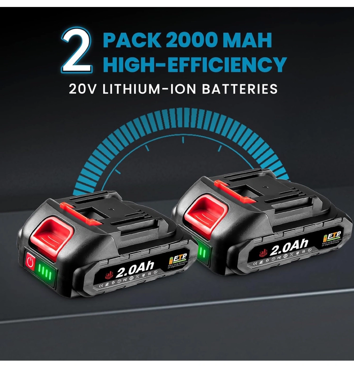 Powerful cordless rotary hammer drill. Includes two 2000mAh lithium-ion batteries and charger. Multiple drill bits and chisels. Pure copper motor. Great for various applications.
