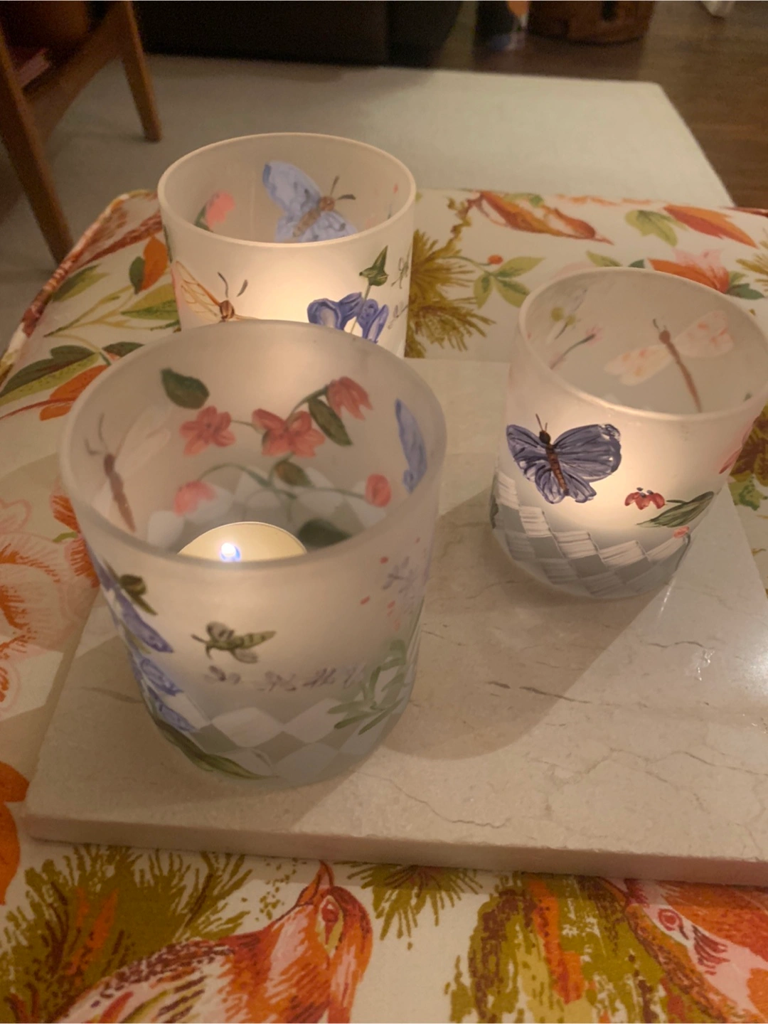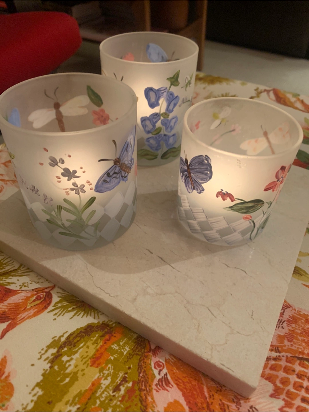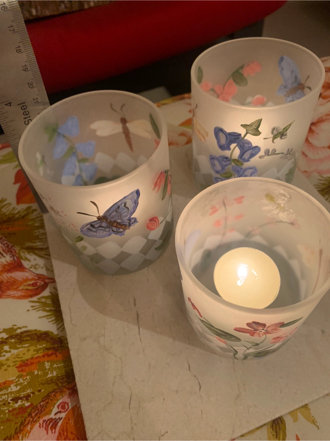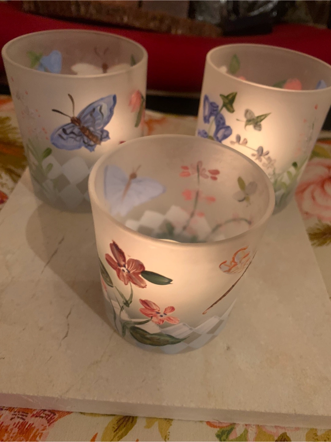 Beautiful set of three glass votive candle holders. They feature frosted glass with hand-painted floral and butterfly designs. Perfect for adding a touch of elegance to your home decor. They are made by the company Variations. No chips or cracks. Would look beautiful on an outside patio, especially at night! ✨