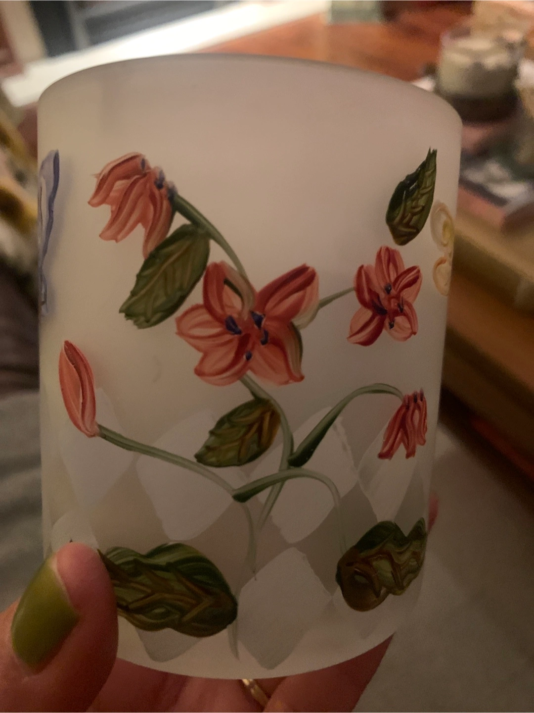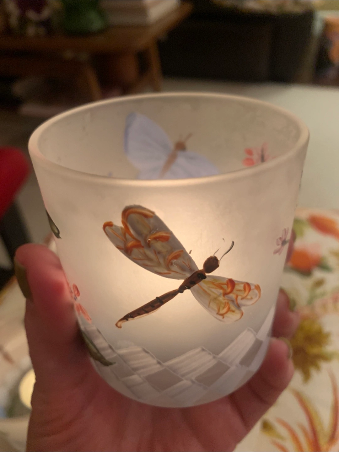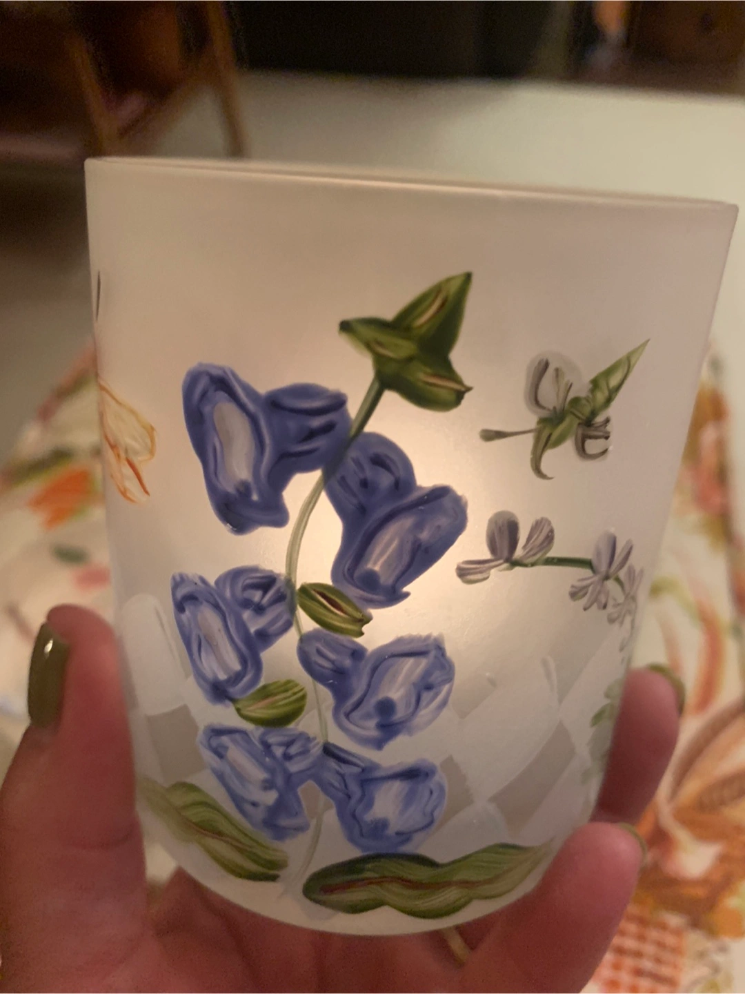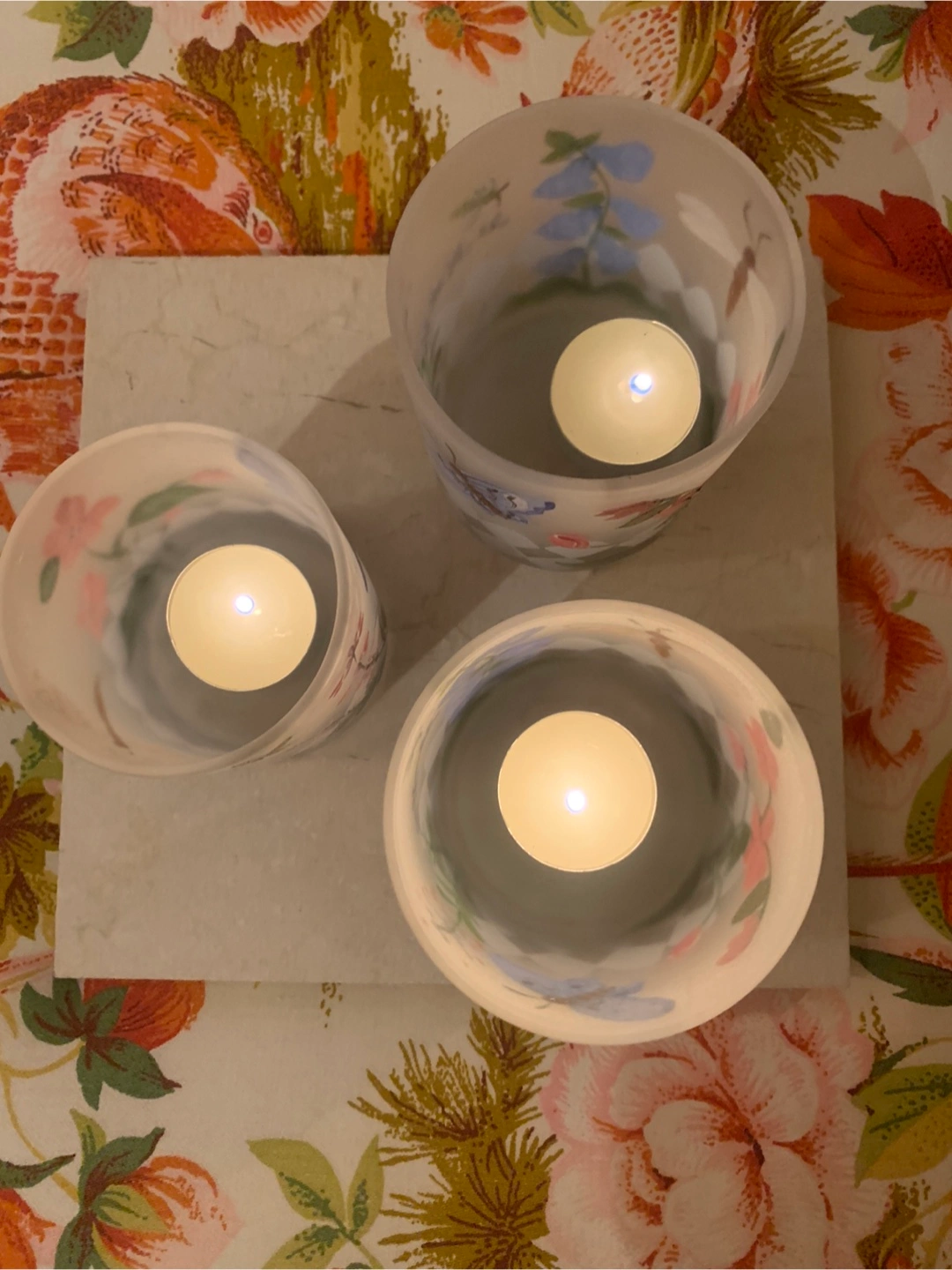 Beautiful set of three glass votive candle holders. They feature frosted glass with hand-painted floral and butterfly designs. Perfect for adding a touch of elegance to your home decor. They are made by the company Variations. No chips or cracks. Would look beautiful on an outside patio, especially at night! ✨