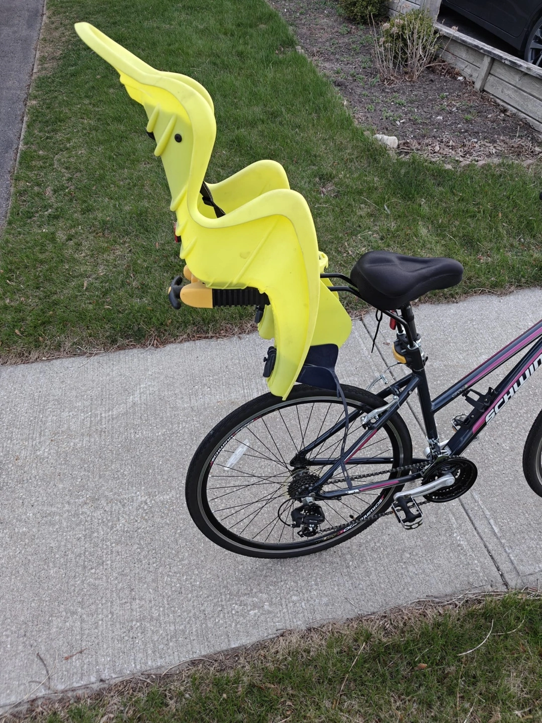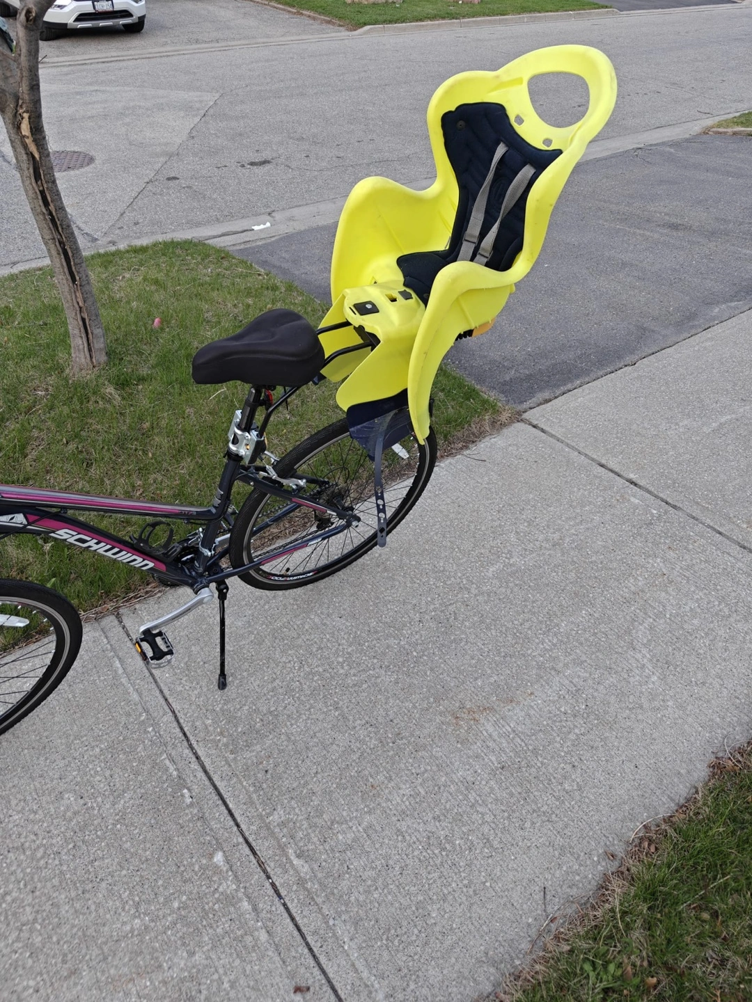 Bright yellow alerts cars to the presence of a child and is a safety plus. In immaculate condition and used with one child. Save big on this top-of-line bike seat. Price is firm.