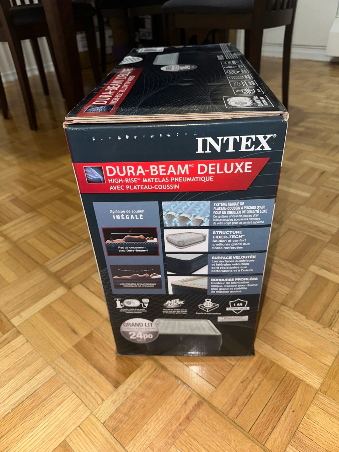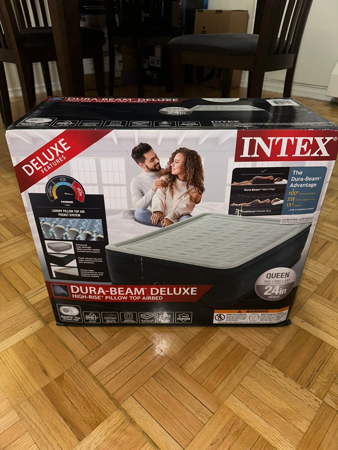 Selling an Intex Dura-Beam Deluxe Queen Airbed (24” height) with built-in pump, luxury pillow top, and durable Fiber-Tech construction.