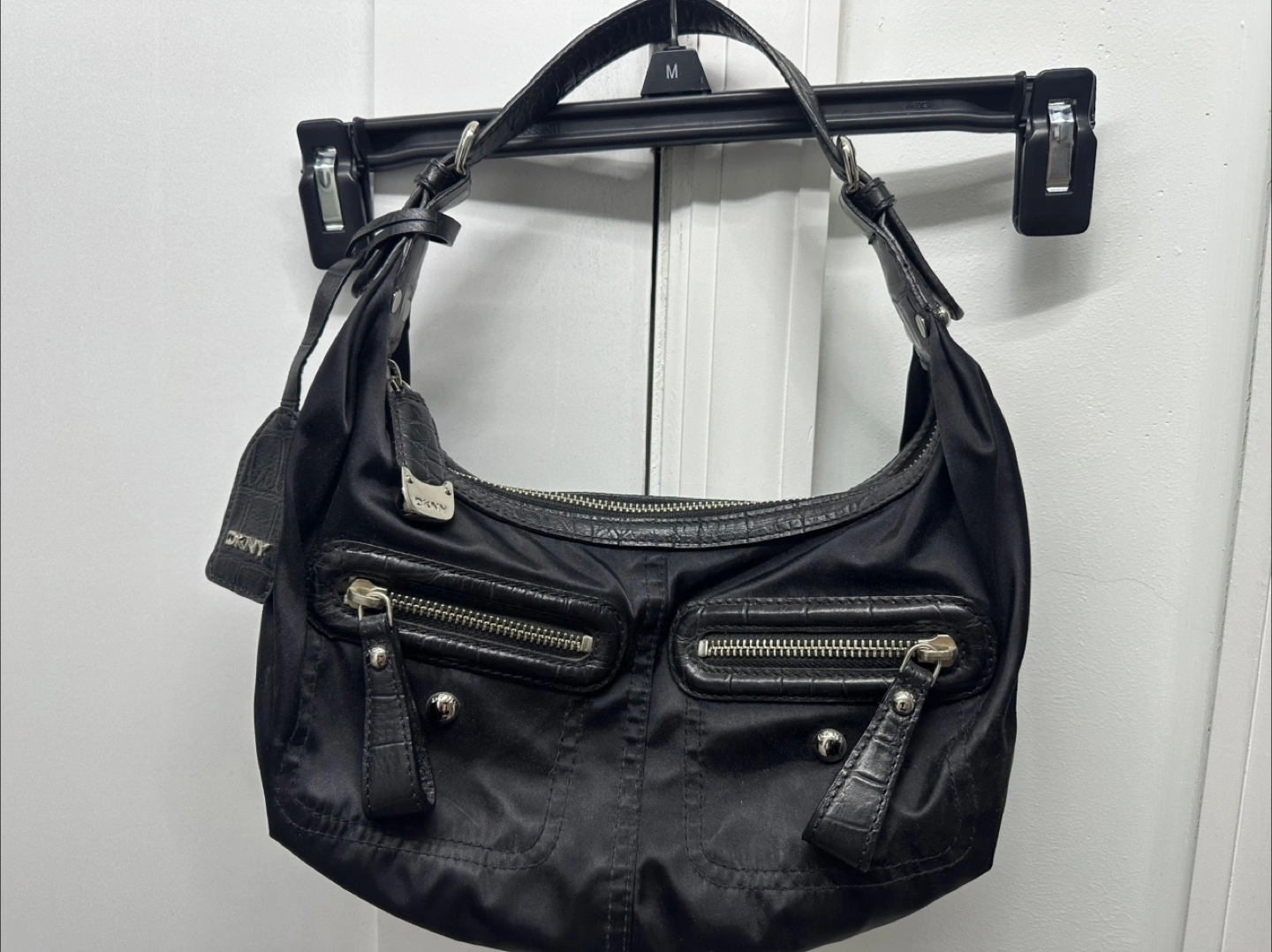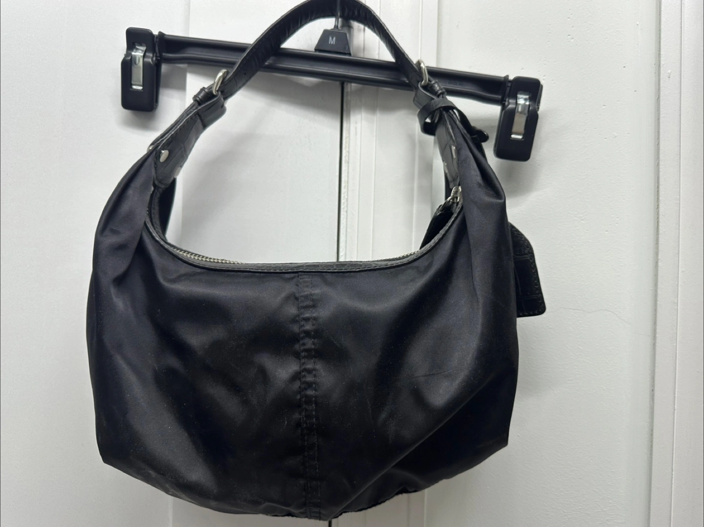 Small black nylon handbag. Features a top handle and zip closure. Multiple pockets. Crocodile-embossed leather accents. I need to clean up my closet.