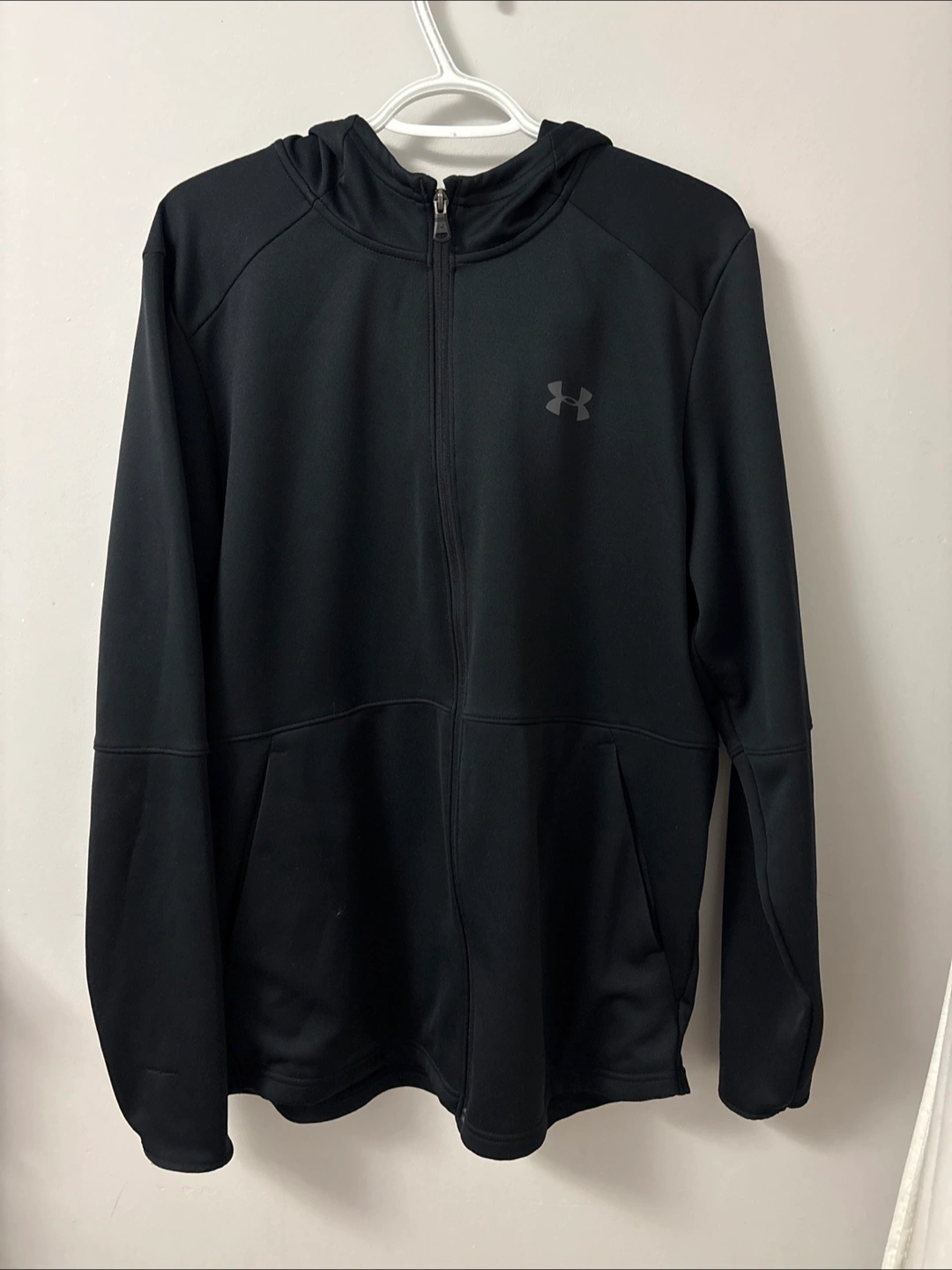 Men's black zip-up hoodie. Full zip closure. Long sleeves. Pockets. Great for layering or casual wear.