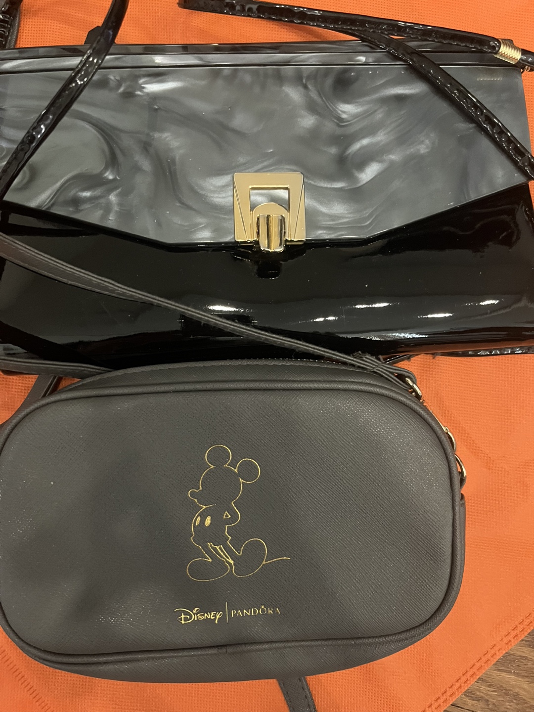 $5 for both bags together.One features a black and grey marble pattern with a gold clasp. The other is black with a gold Mickey Mouse design and Pandora branding. Both bags have shoulder straps.