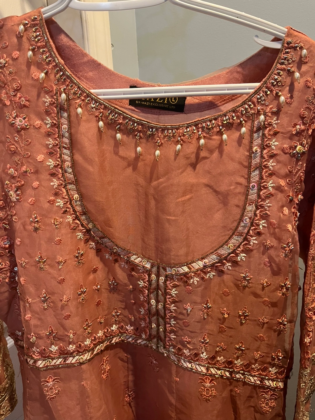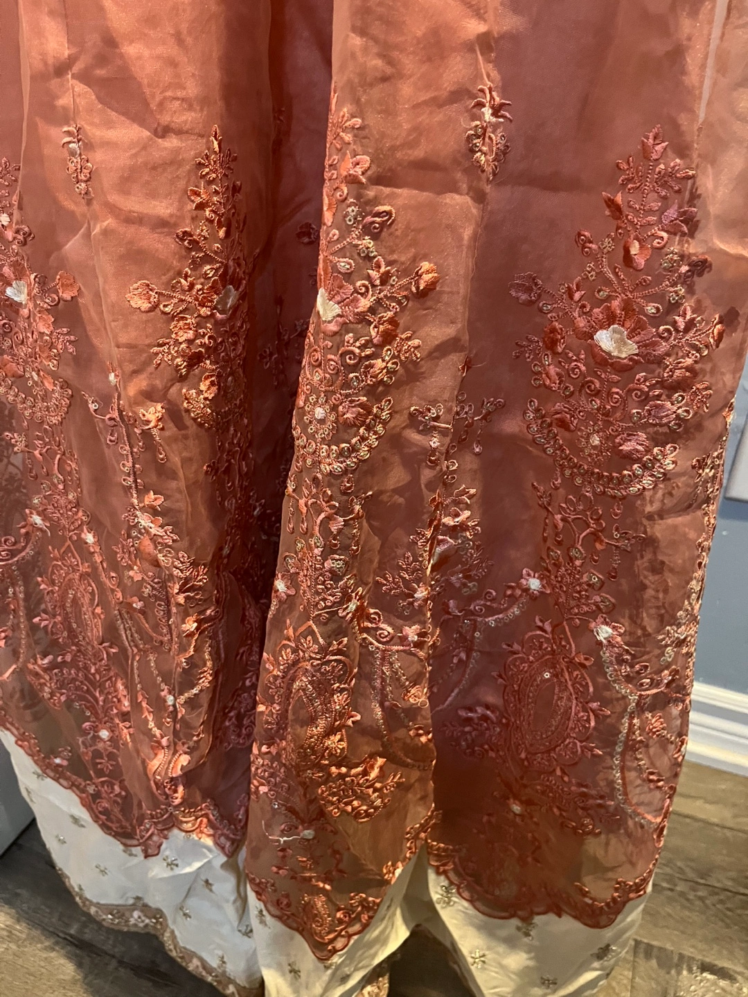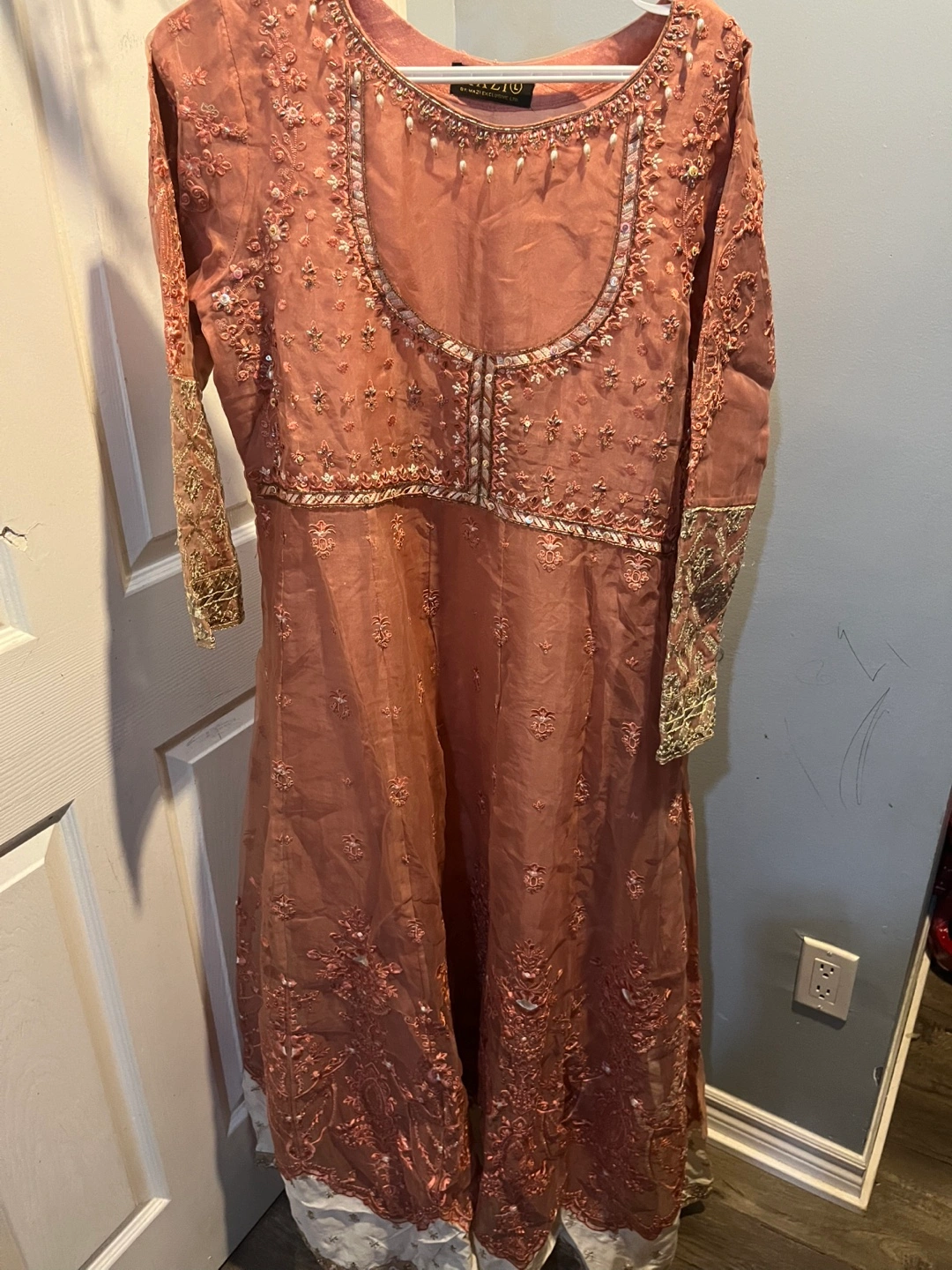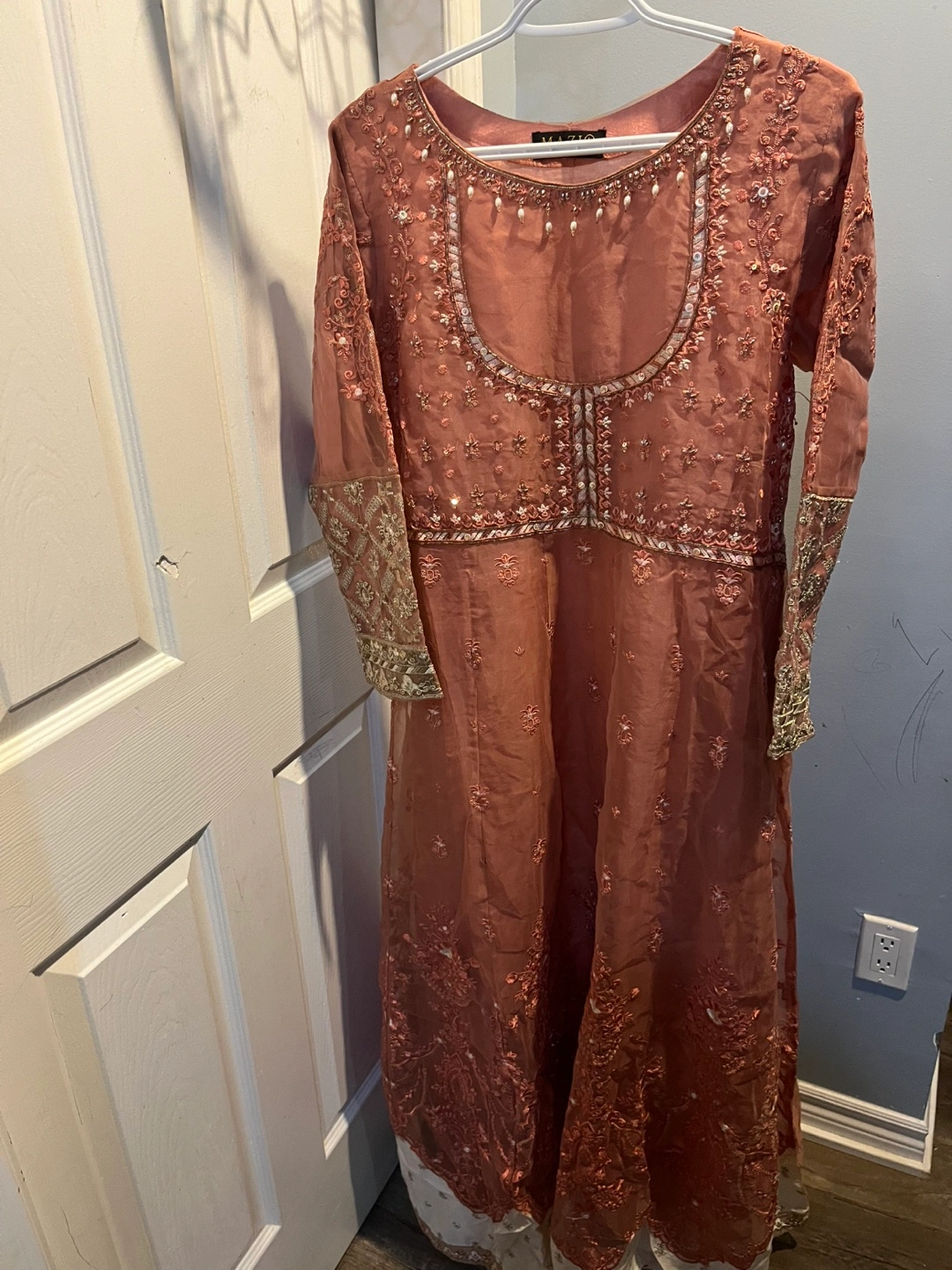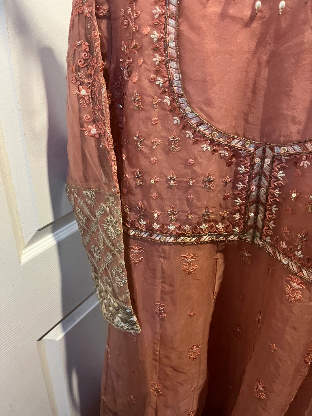 Beautiful dusty rose embroidered women long dress. Intricate detailing throughout. Long sleeves. Floor length. Elegant and festive. Perfect for special occasions.