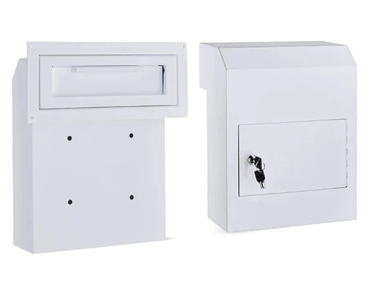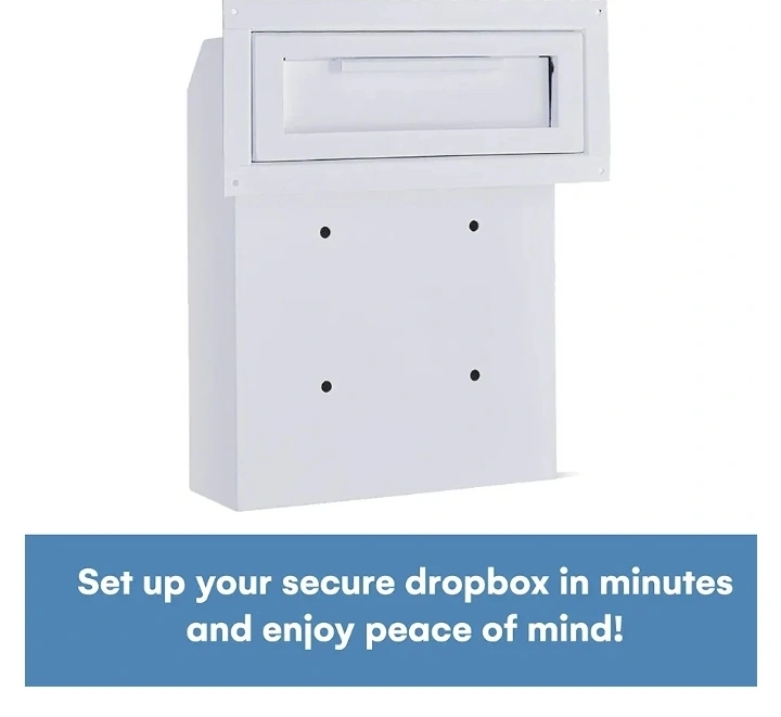 914White metal outdoor secure drop box. Easy installation. Features a keyed access door and a slot for drop-offs. Powder coated for rust prevention. Includes anti-theft tubular key. Dimensions approximately 17.4"H x 14.72"W x 9"D. Cash only, pick up only at the Juntion area, near StockYards.