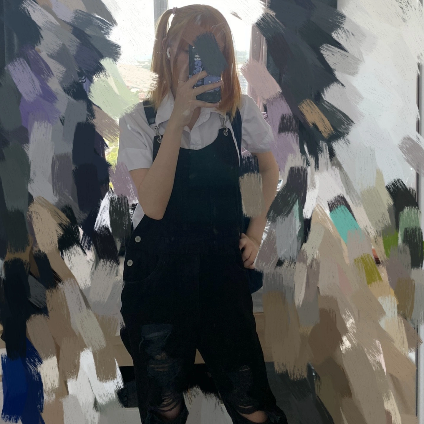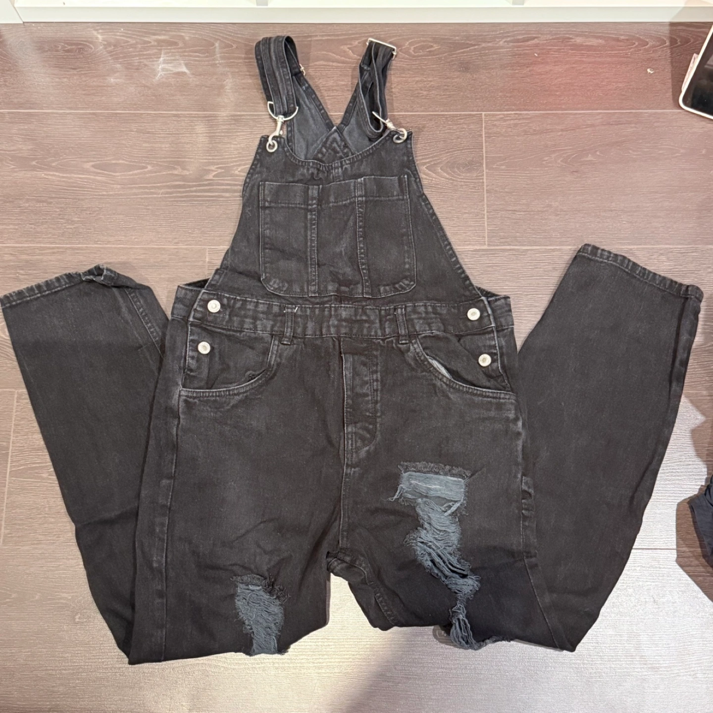 Black denim overalls. Distressed detailing. Adjustable straps. Multiple pockets. Size Medium.