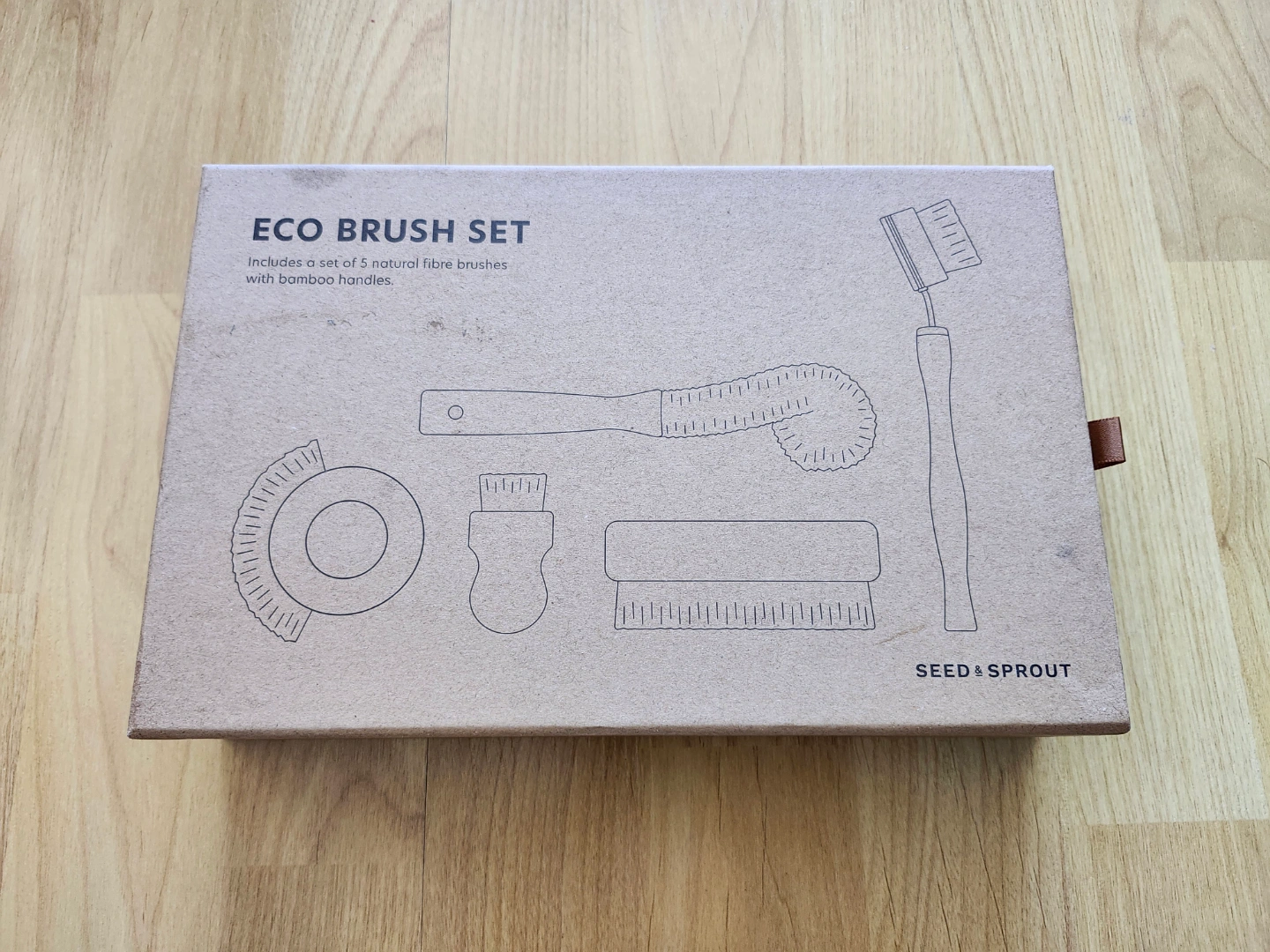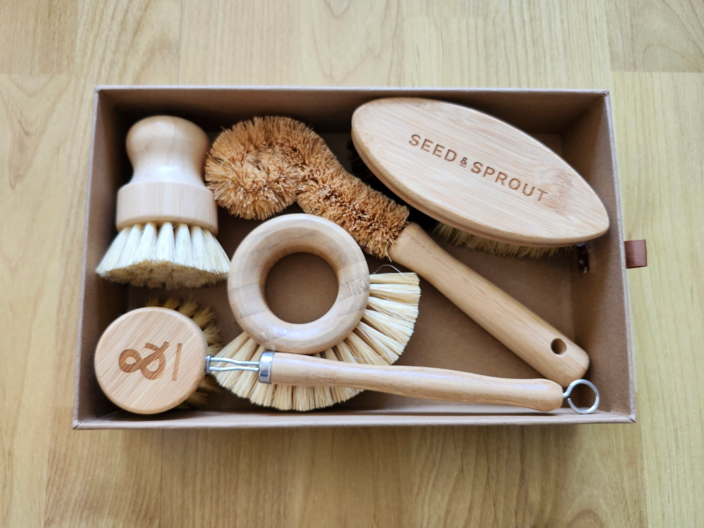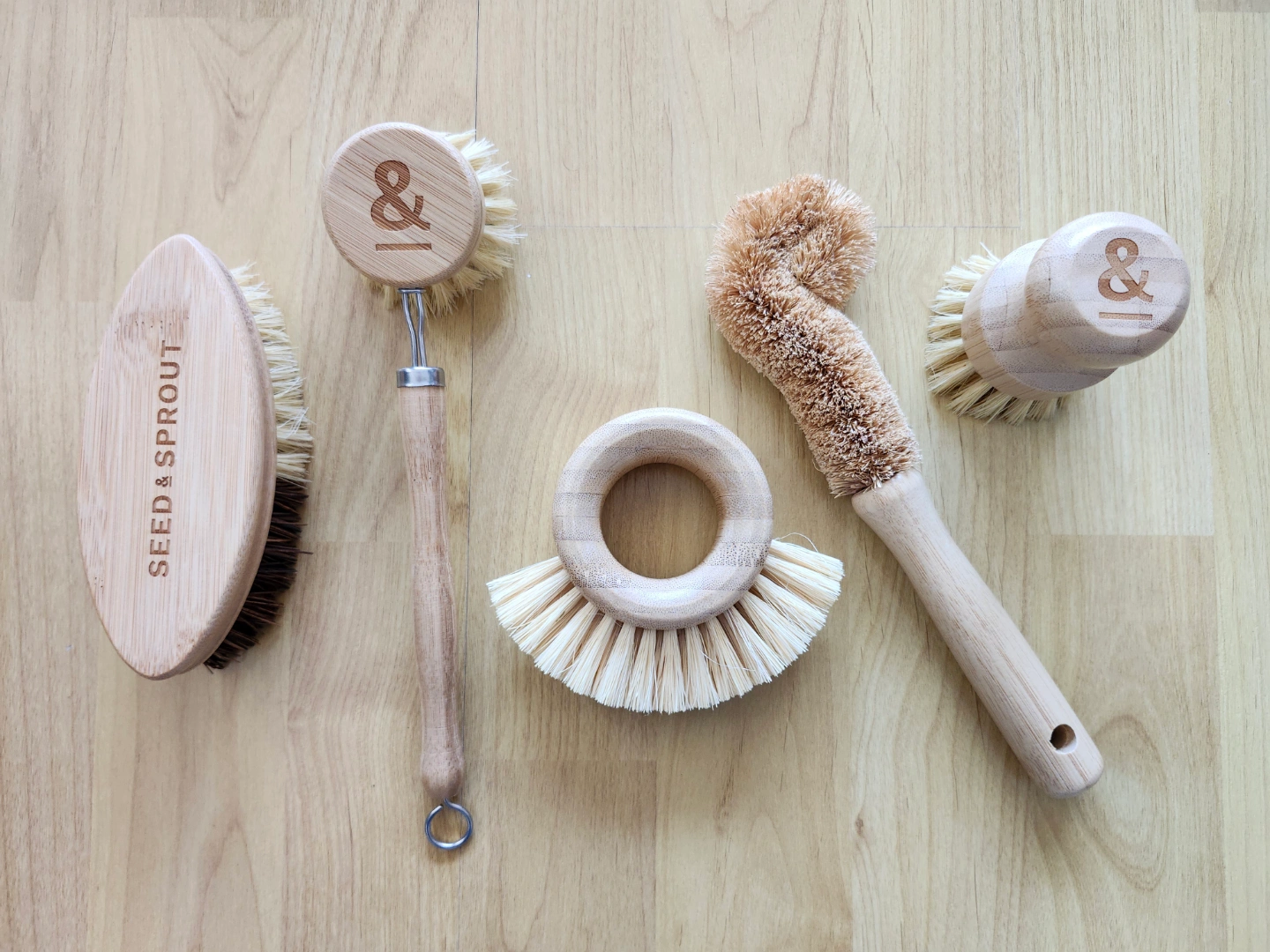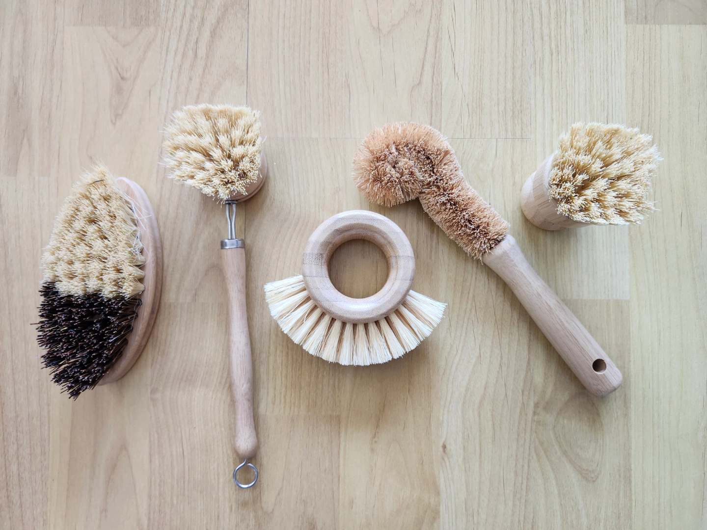 Five natural fibre brushes. Bamboo handles. Includes bottle brush, curved brush, two round brushes, and an oval brush. Eco-friendly cleaning set. Brand new in box.