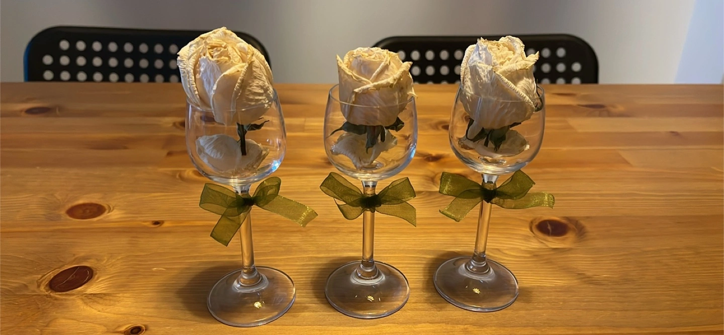 Three stemmed glasses, each containing a single dried rose. Green ribbon accents. Perfect for wedding, anniversary or home decor. Minimalist style.