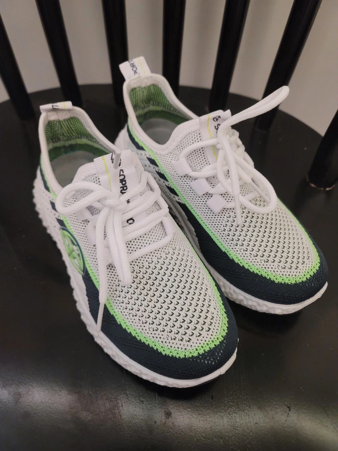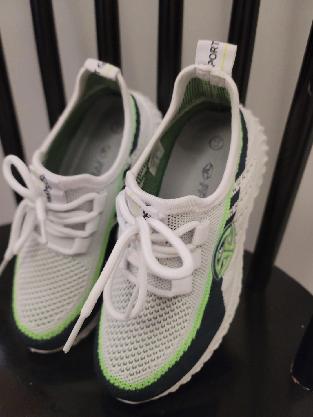 Cute kids' sneakers. White and light green colour scheme. Breathable knit upper. Comfortable sole. Lace-up closure. Great for everyday wear. My son has outgrown these shoes before he had a chance to wear them so it's pretty new.