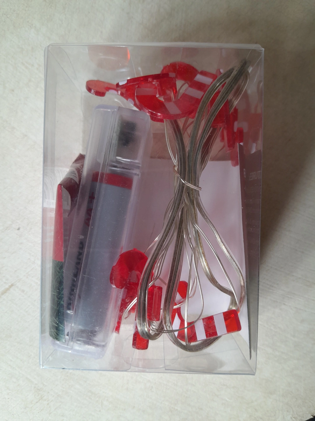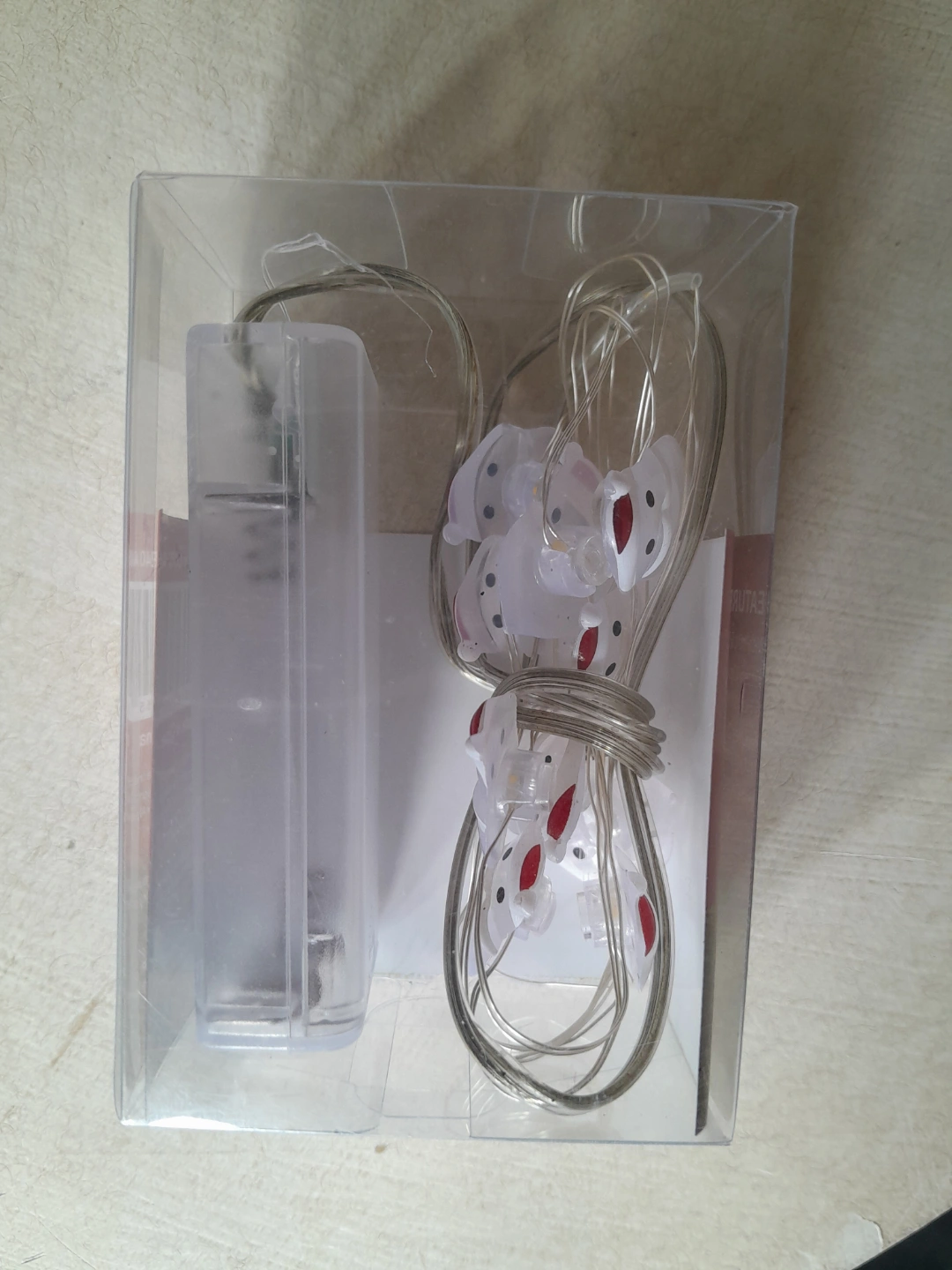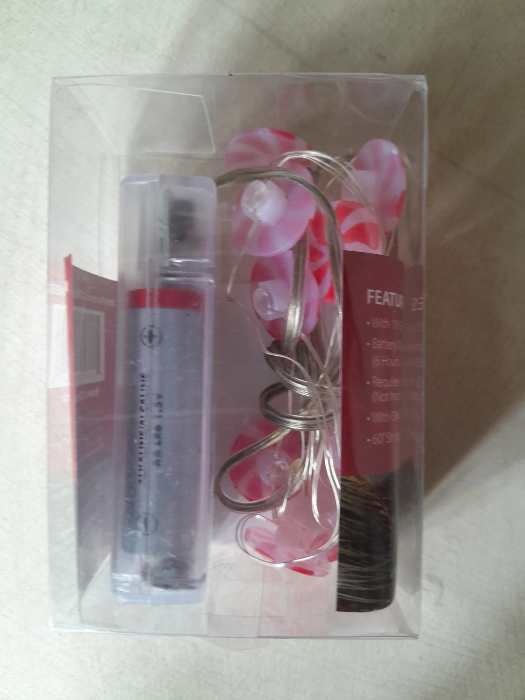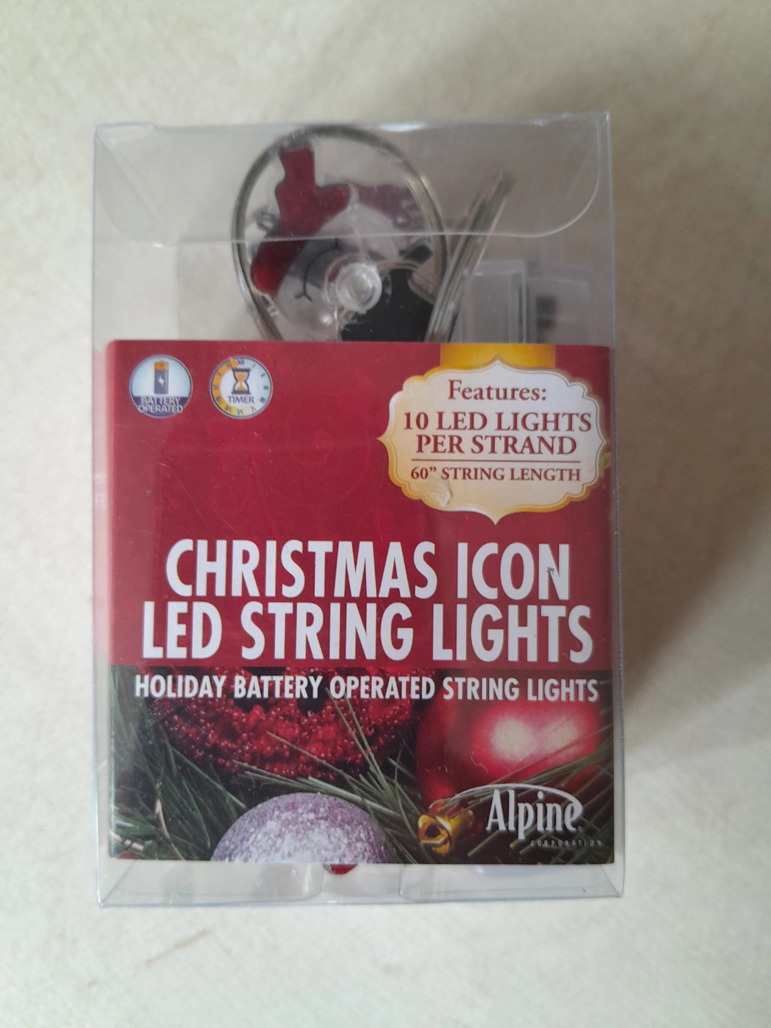 Unused. Battery-operated LED string lights. 10 lights per strand. 60" length. Various designs: snowman, candy cane, santa & peppermints.