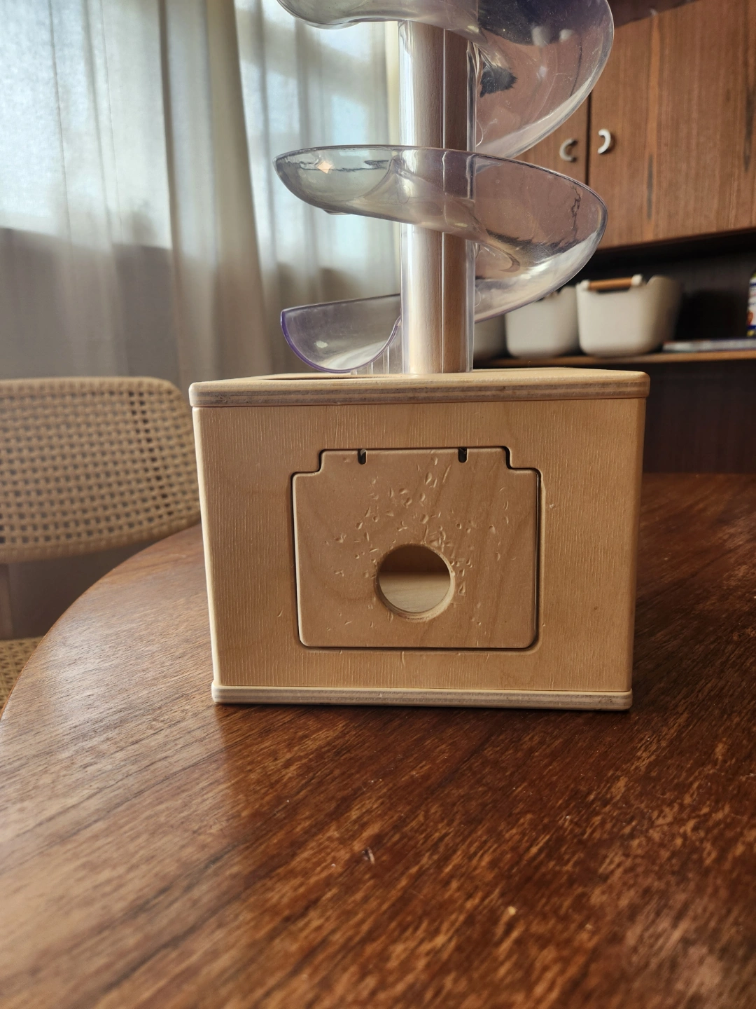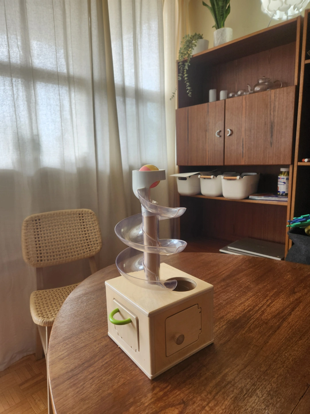 Adorable wooden marble run. Features a spiral track and a small wooden box. Includes a few colourful marbles. Great for toddlers and preschoolers. Fun and engaging.