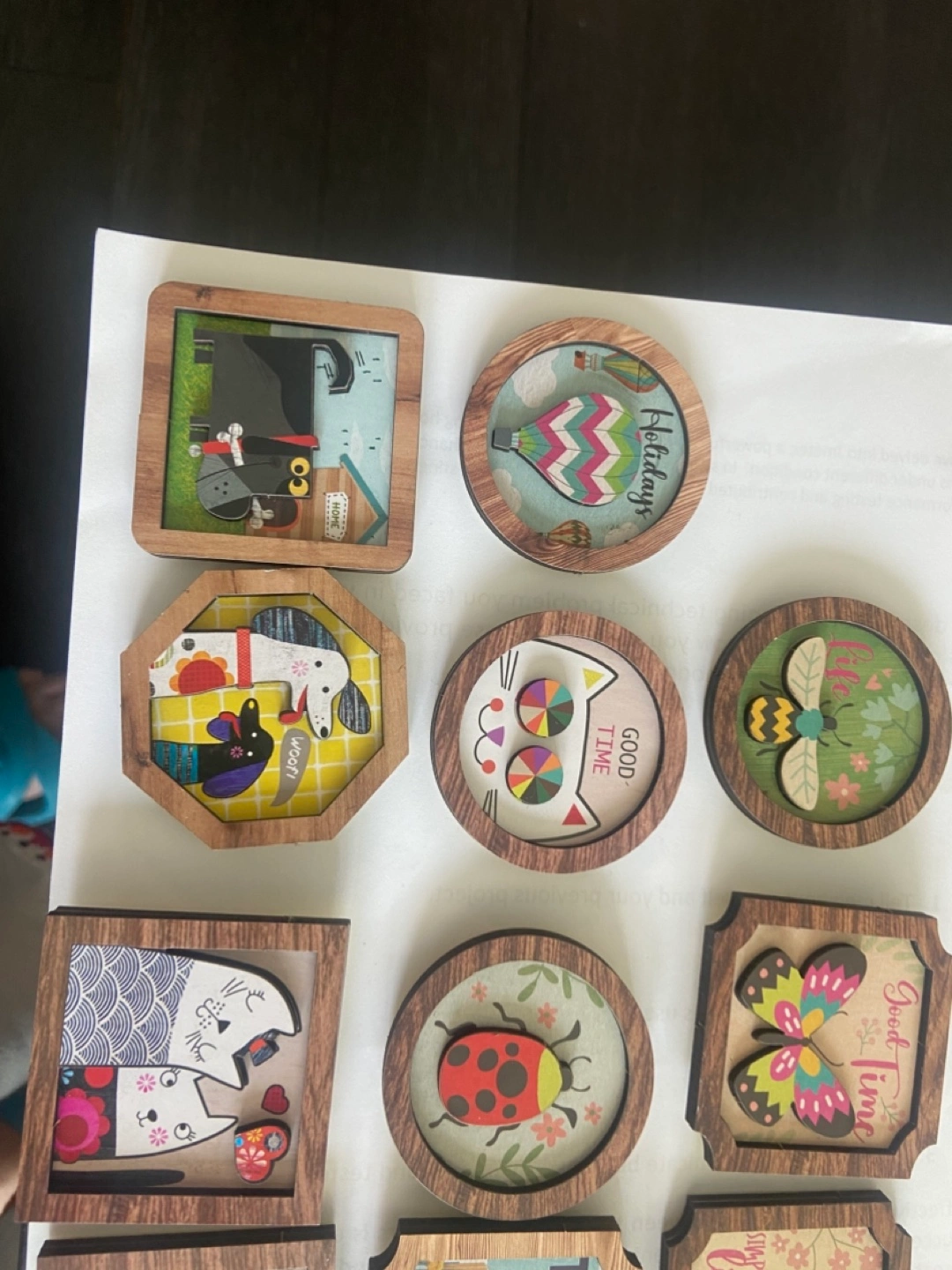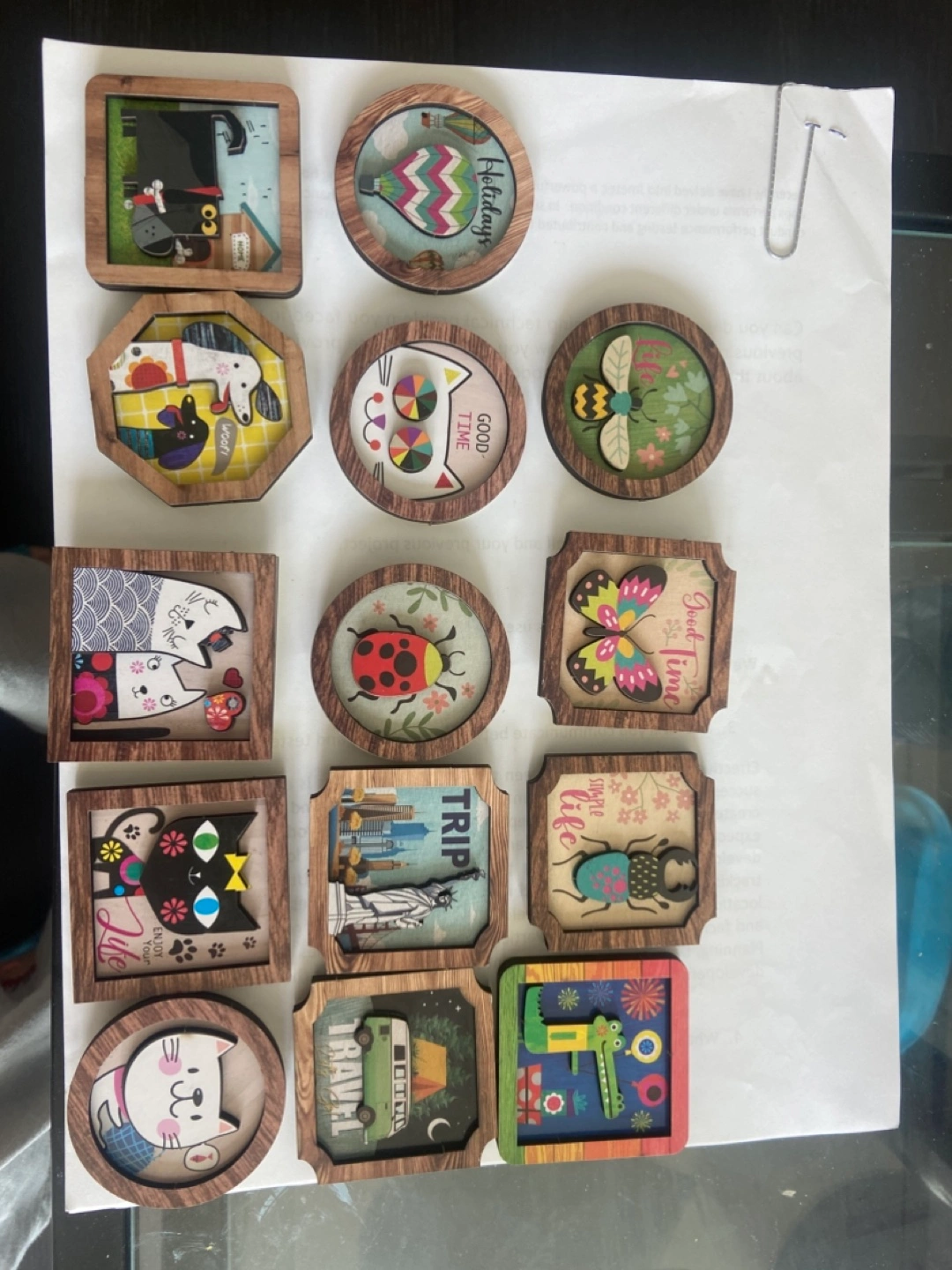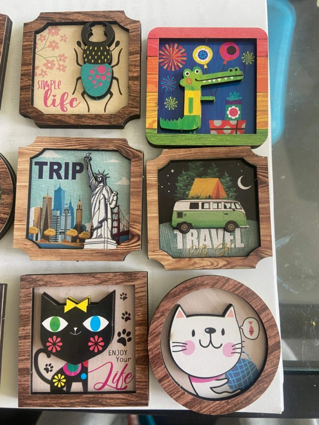 3D unique wooden fridge magnets. Features various cute animals, travel scenes, and inspirational phrases. Perfect for adding personality to your kitchen or office.
