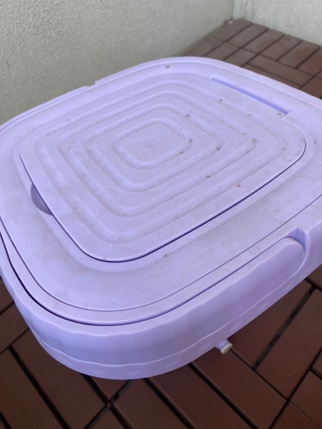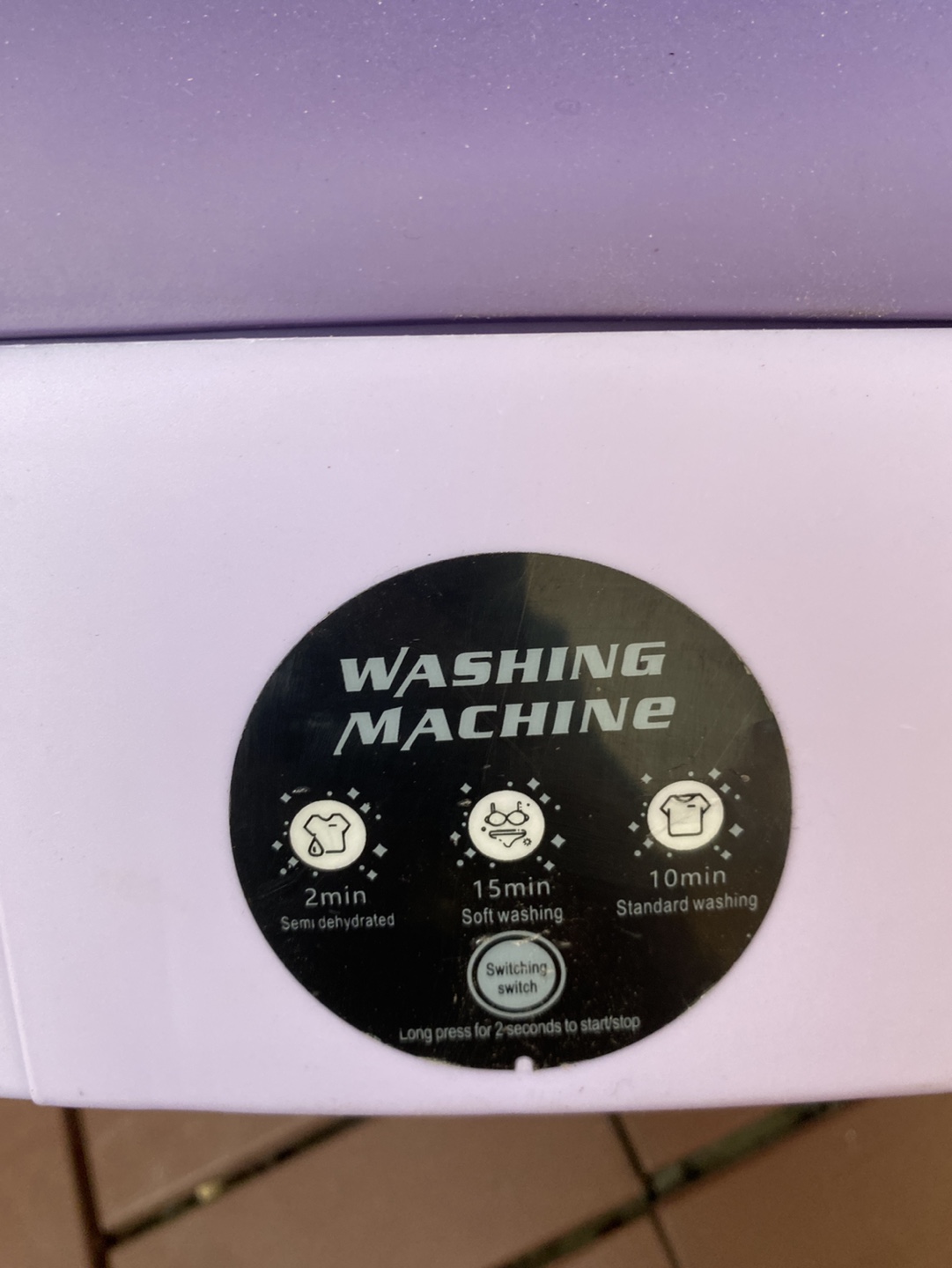 Mini washing machine. Three washing cycles: 2-minute semi-dehydrated, 15-minute soft wash, and 10-minute standard wash. Includes power adapter and drainage hose. Purple plastic casing. Pre-owned.