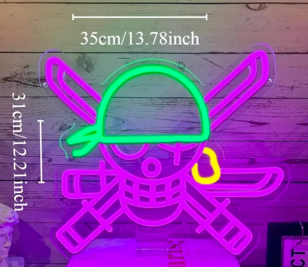 LED neon sign. Purple and green. Features the One Piece Jolly Roger skull and crossbones. Approximately 31cm x 35cm.