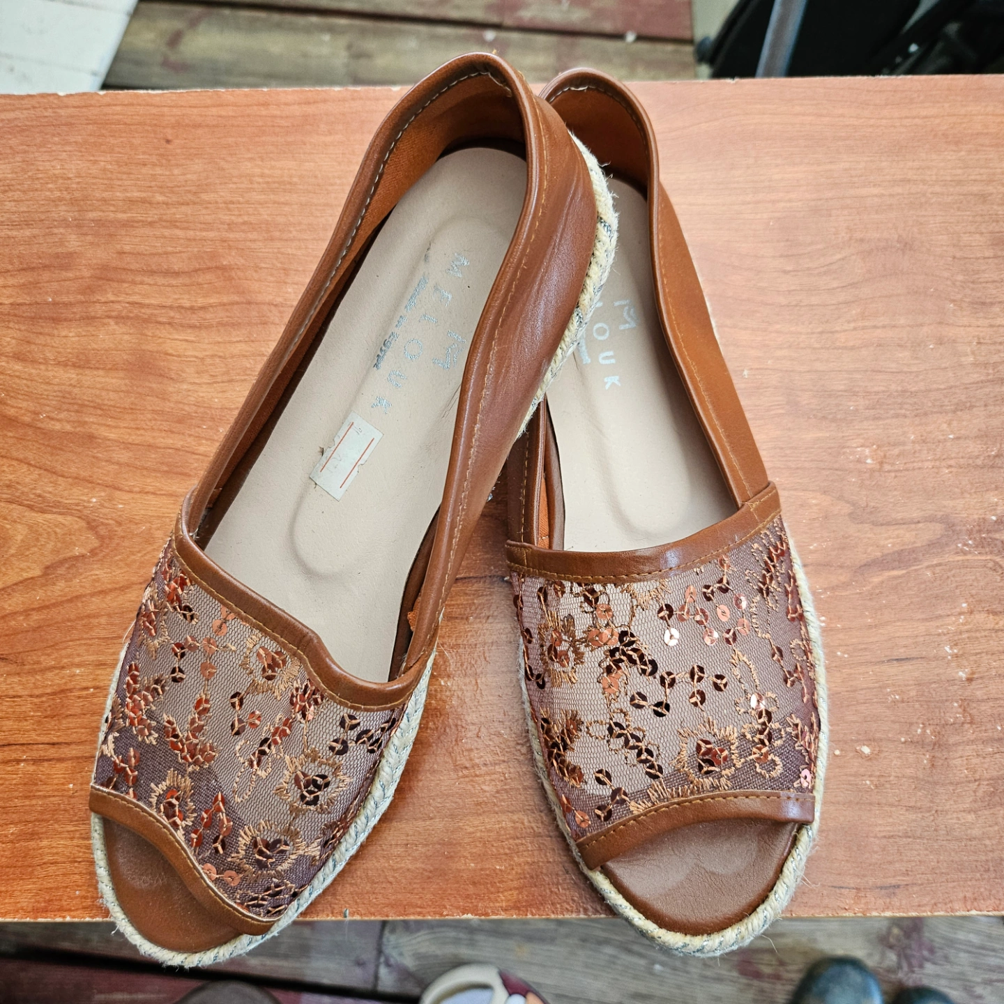 Women's brown espadrille shoes. Size 37. Peep-toe style. Sequin detail on the toe. Lightly worn.