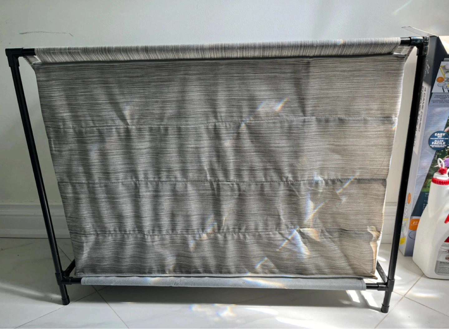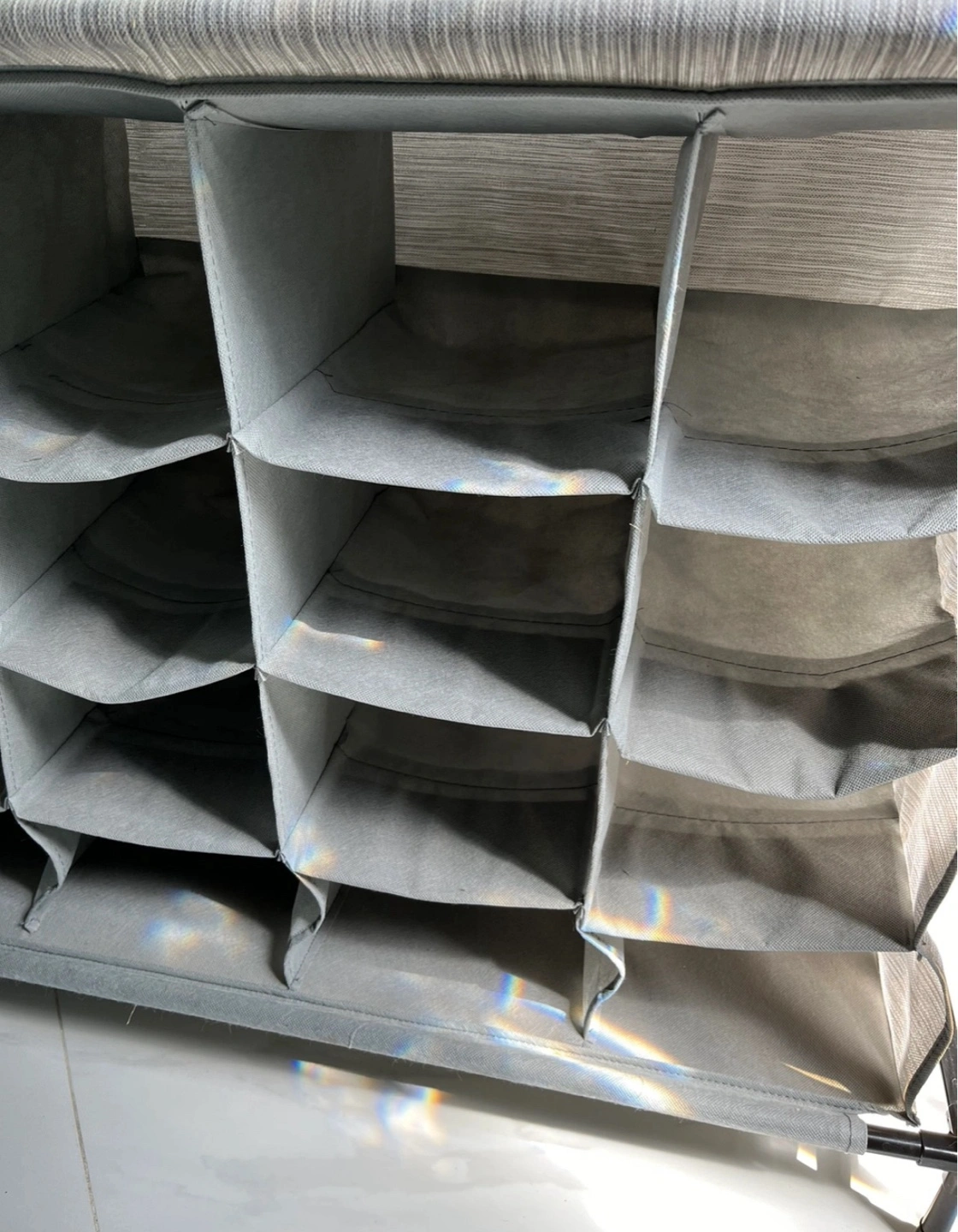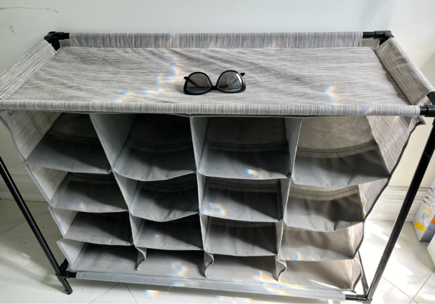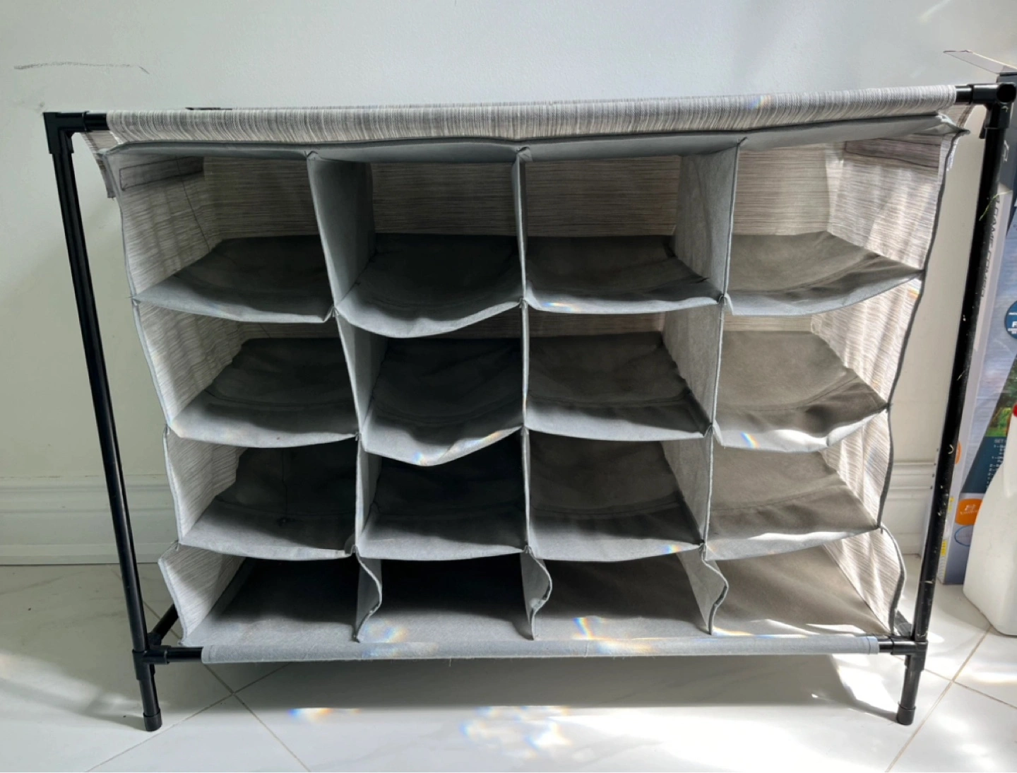 Smoke free pet free home Pick up only. Yonge & Steeles Item brought to driveway Kitchen Stuff Plus - 16 pair fabric shoe organizer in grey. Rods are metal so strong. Small tray on top for hats sunglasses keys Excellent condition and always indoors Disassembled for easy transport Dimensions 84x 35x 66 cm