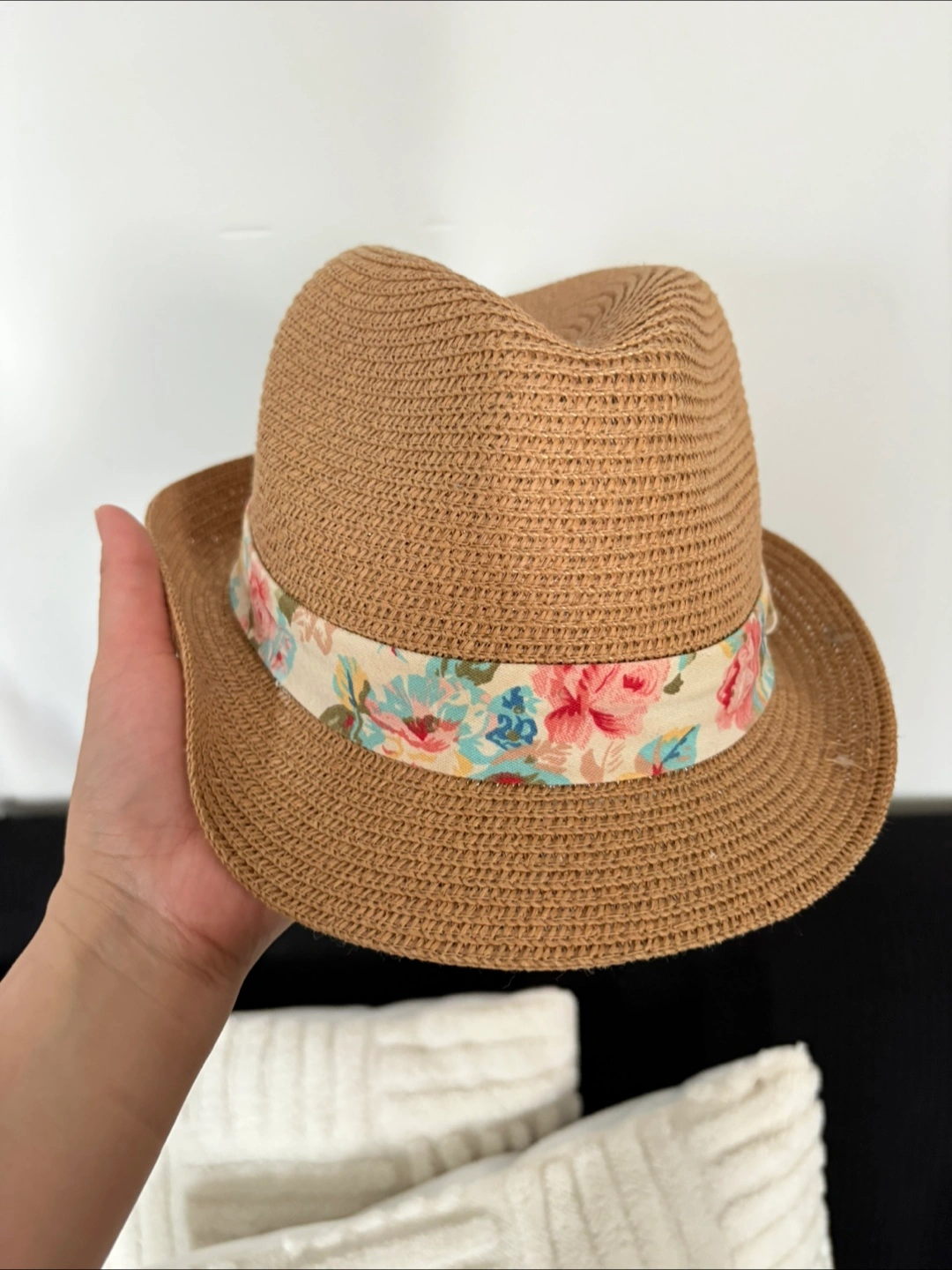 987Adorable summer hat. Lightweight straw material. Features a pretty floral ribbon. Perfect for sunny days. In good condition