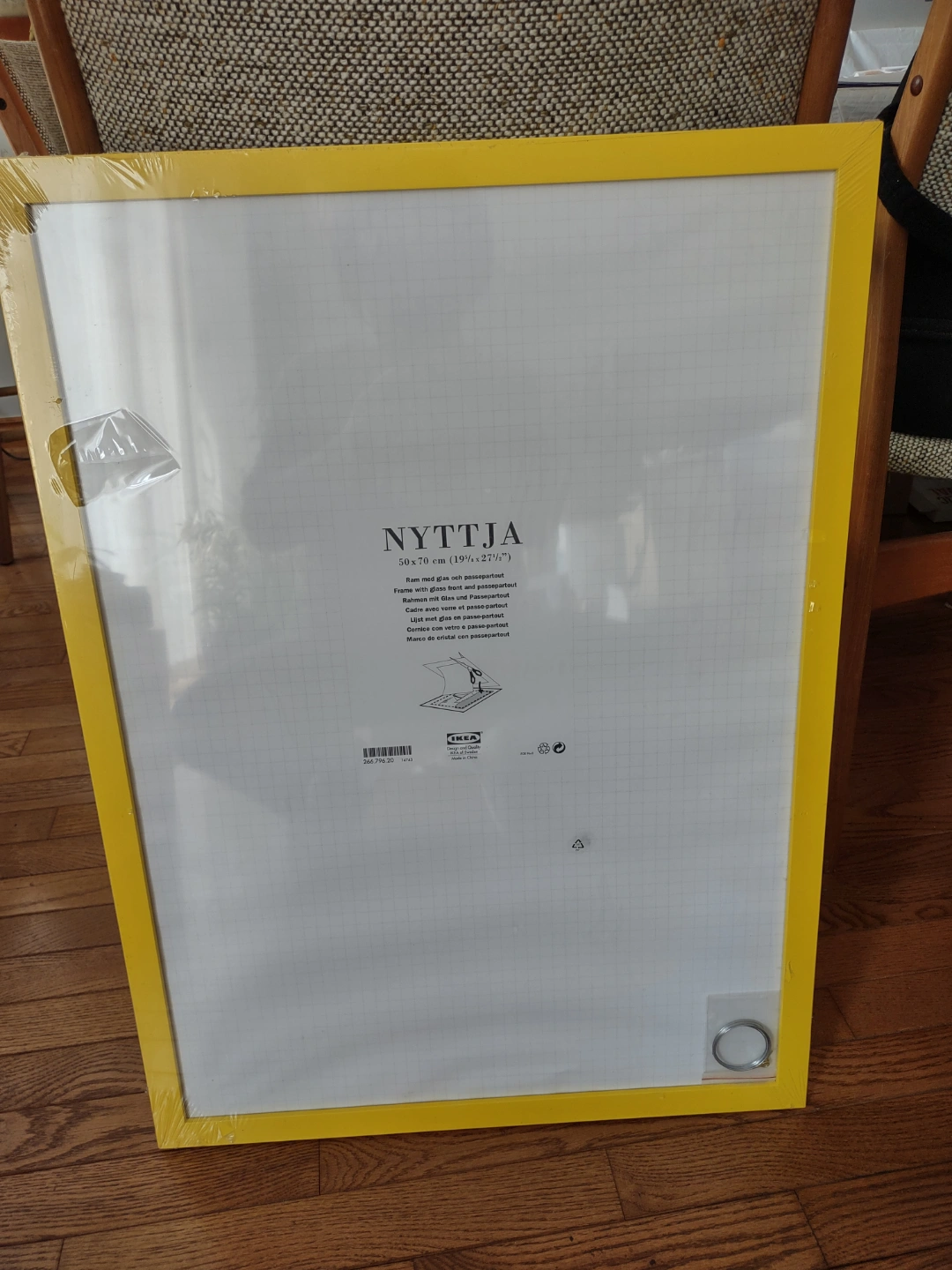 New IKEA NYTTJA picture frame. Yellow frame with glass and passe-partout. Size: 50x70 cm (19x27"). Still in original packaging.