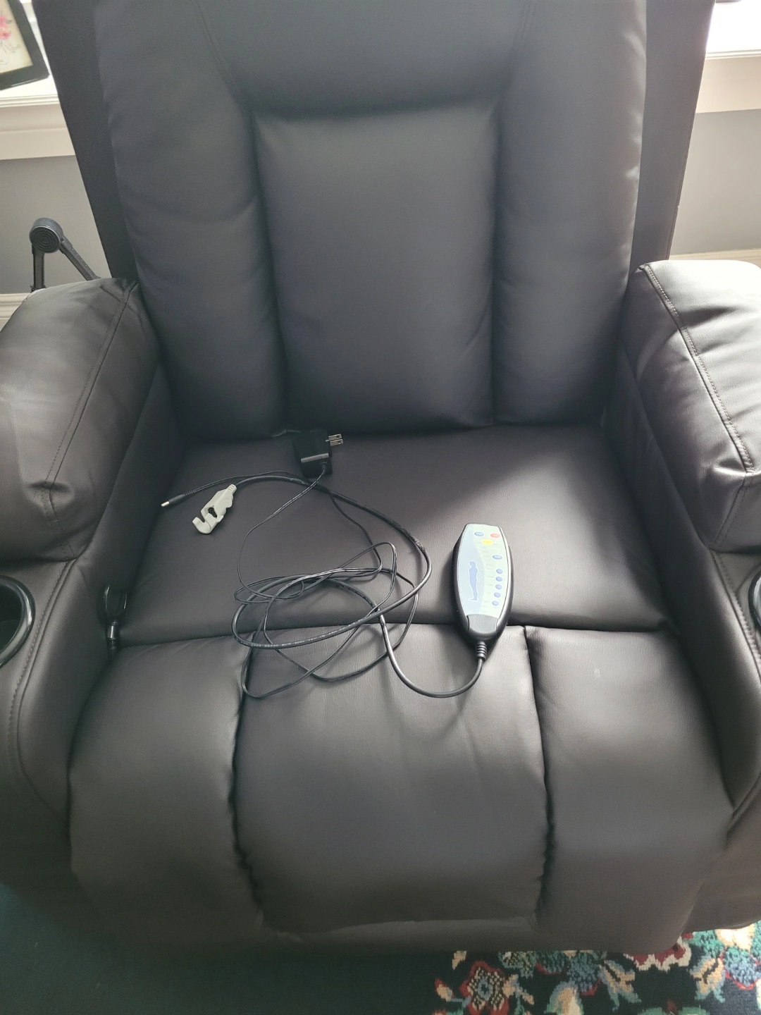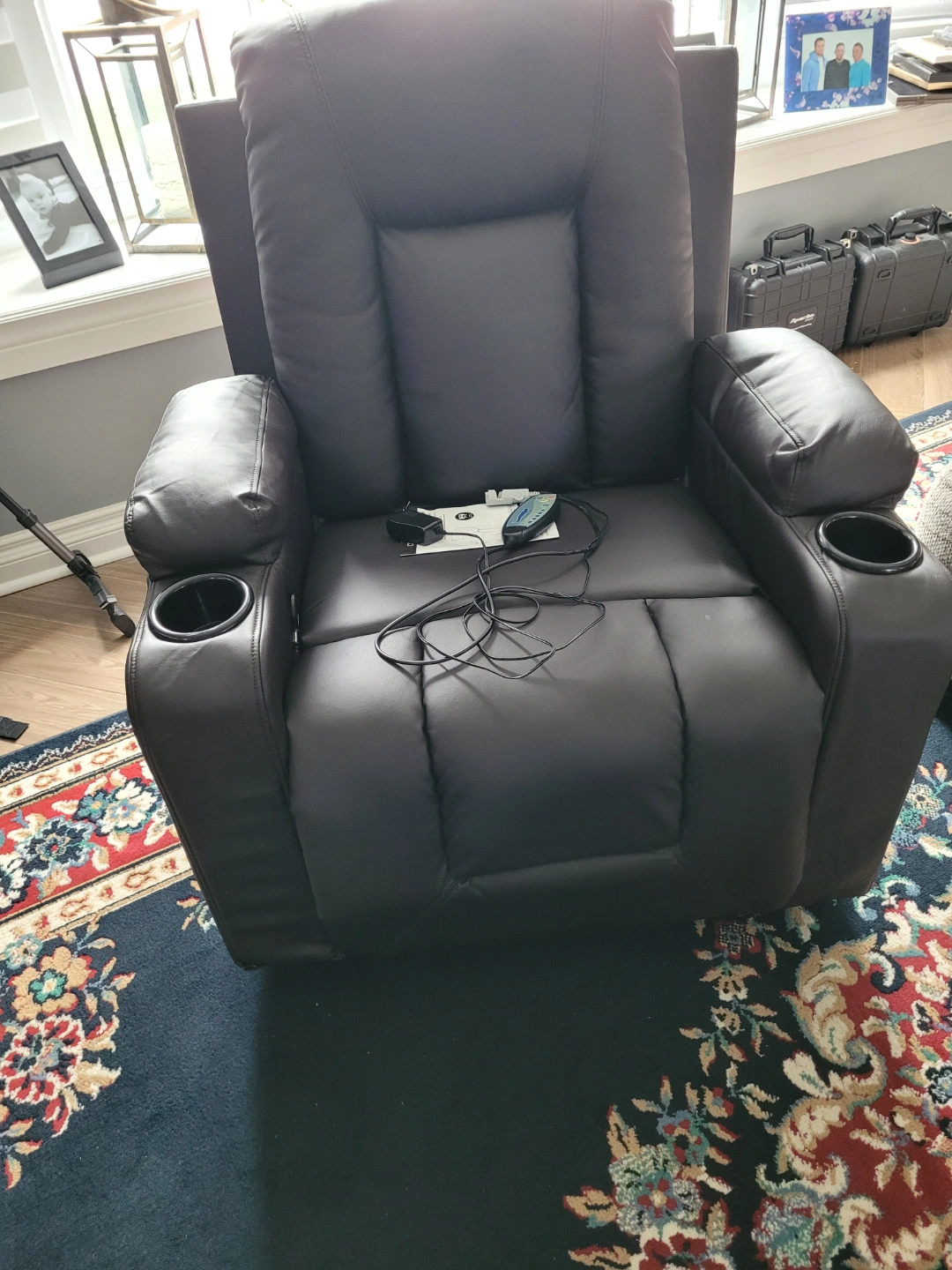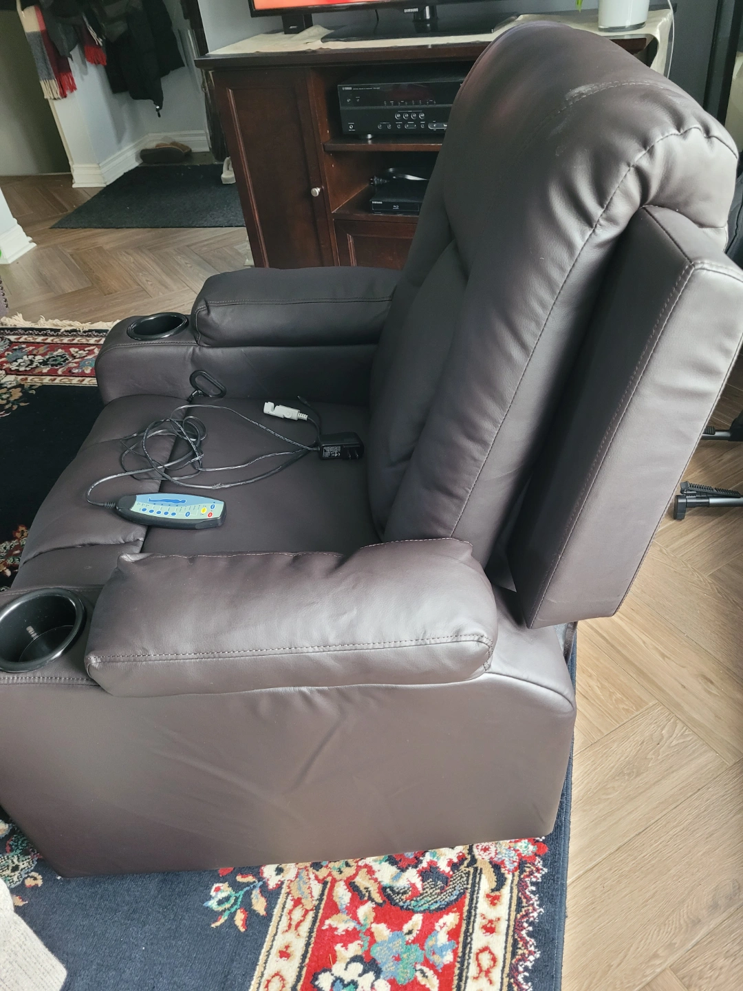 Leather Rocking chair and recliner, brown, has massage therapy built in, as well as heat. Only 8 months new, purchased for my mom but she never got to use it. Very comfy, I just don't have a place to put it. Original instructional/information booklet with all information include, pocket on the side to hide remotes. Also 2 cup holders for a tea or a drink and reaxing. Purchased for $1,600 new from Ashley's, comes apart easily for transportation. Assistance for seniors who have mobility issues as this chair will lower you from a standing position to sit down. Excellent condition-New