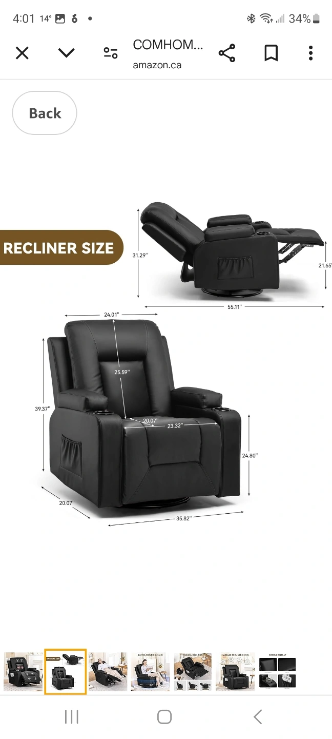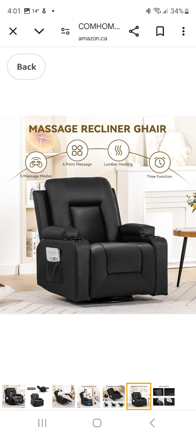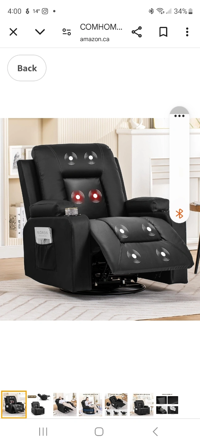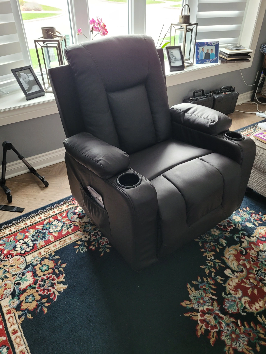 Leather Rocking chair and recliner, brown, has massage therapy built in, as well as heat. Only 8 months new, purchased for my mom but she never got to use it. Very comfy, I just don't have a place to put it. Original instructional/information booklet with all information include, pocket on the side to hide remotes. Also 2 cup holders for a tea or a drink and reaxing. Purchased for $1,600 new from Ashley's, comes apart easily for transportation. Assistance for seniors who have mobility issues as this chair will lower you from a standing position to sit down. Excellent condition-New