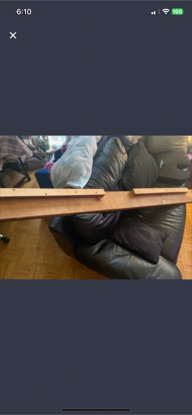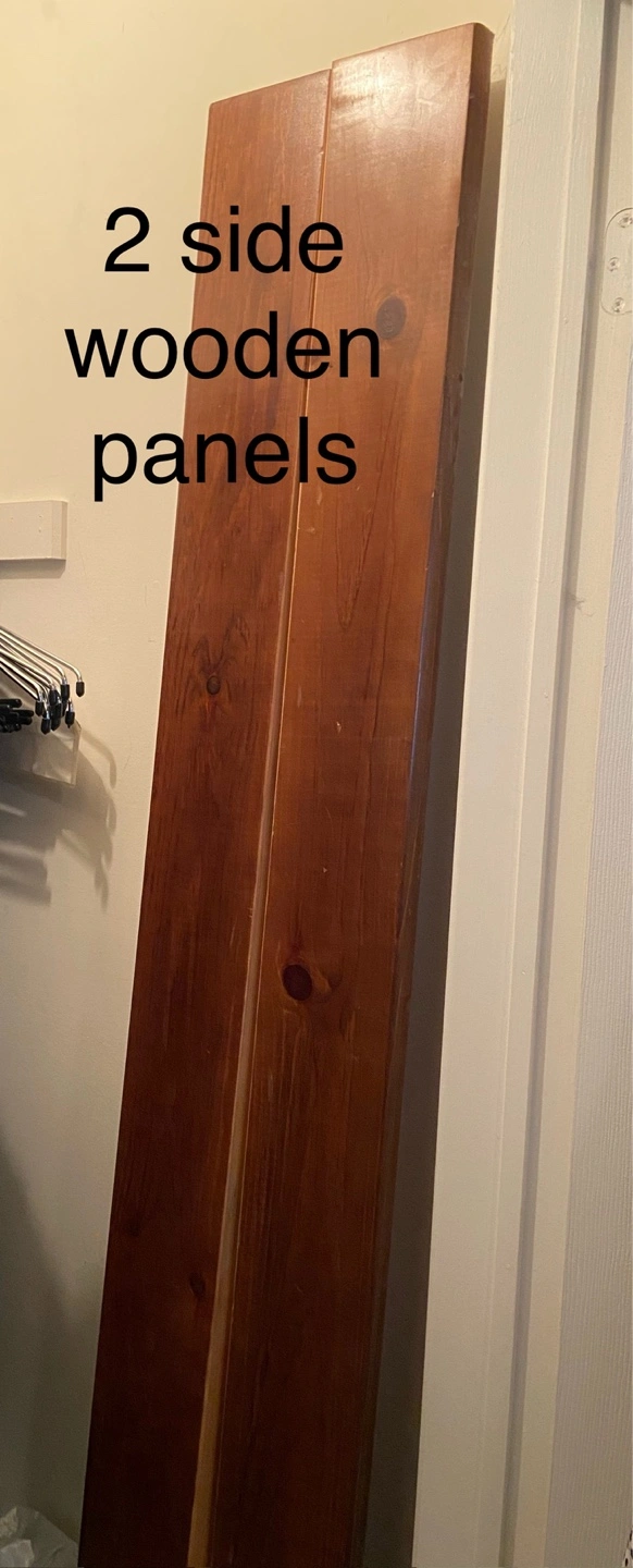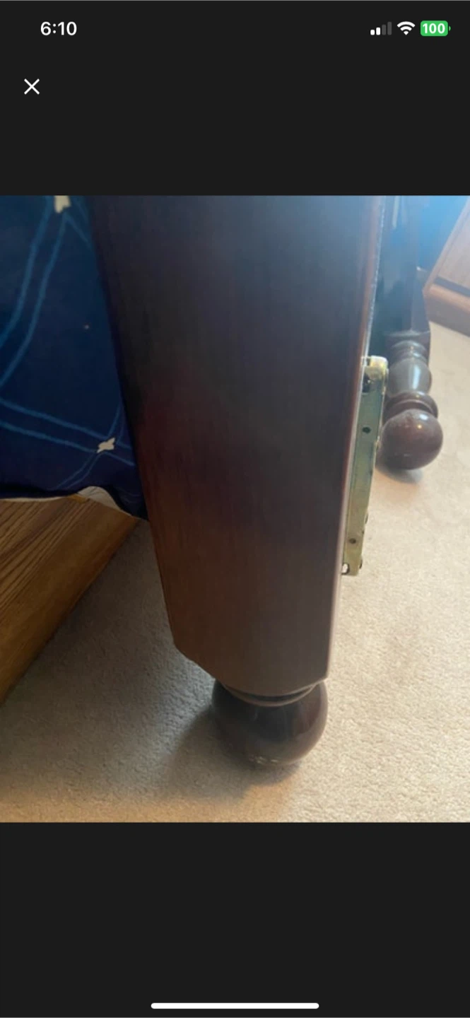 Dark brown queen size bed frame. Includes headboard, footboard, and side rails. Solid wood construction. Some minor wear and tear.