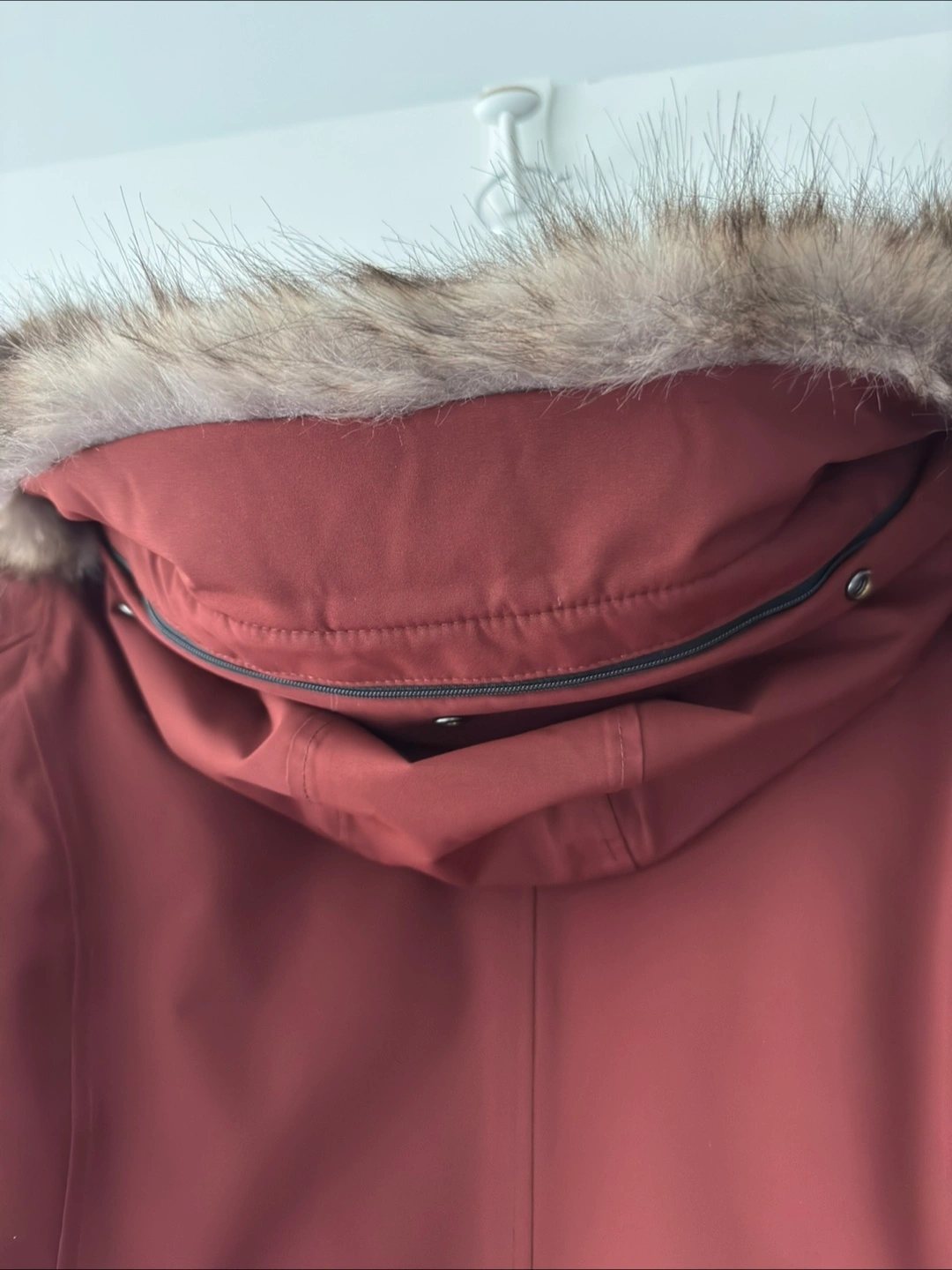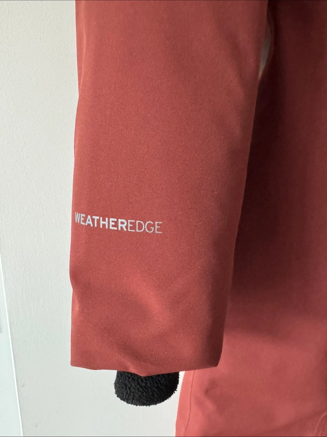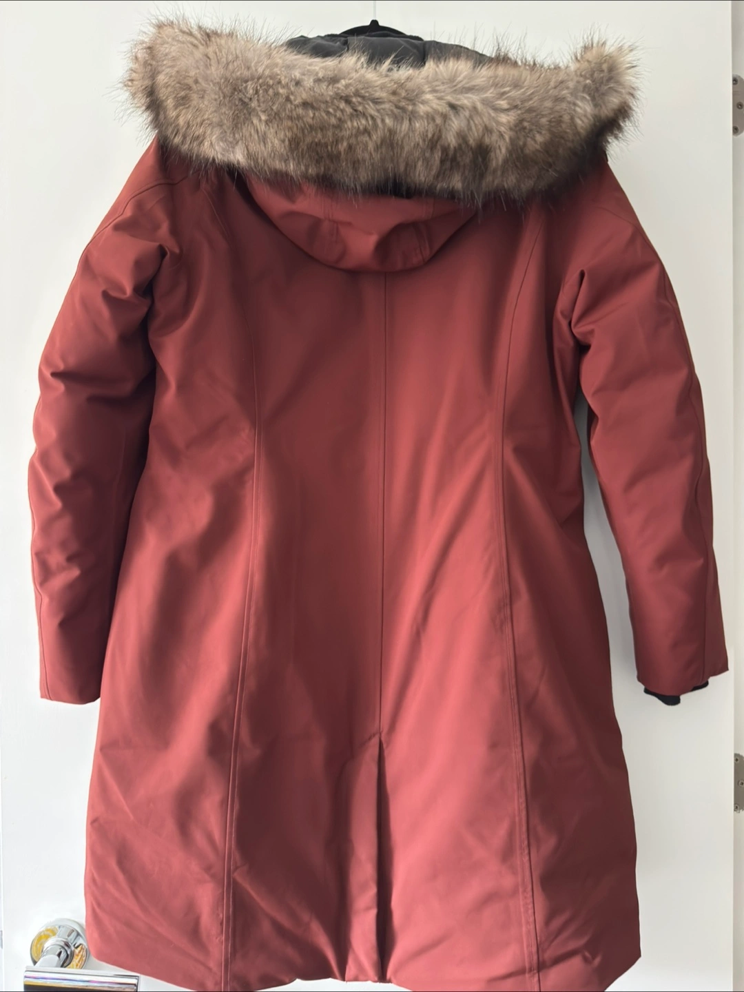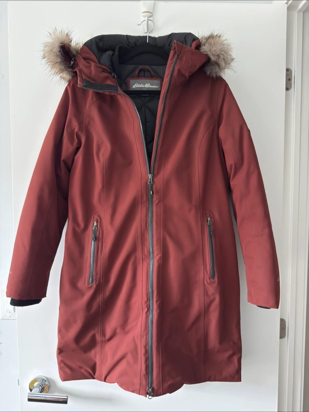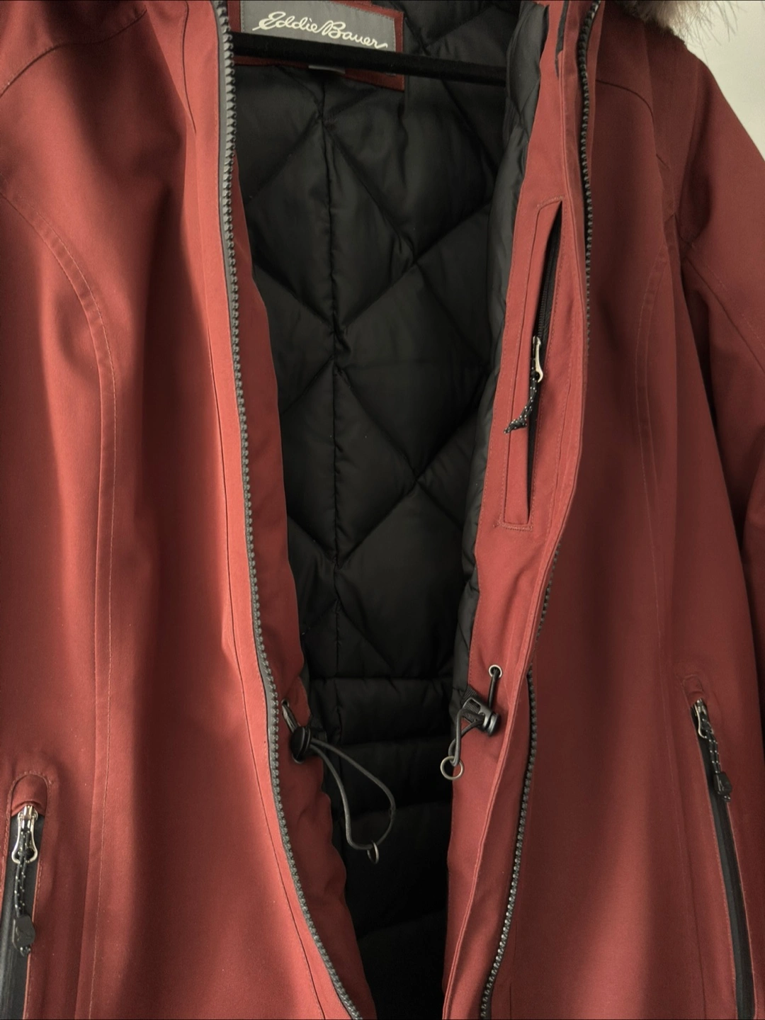Women's size medium maroon Eddie Bauer parka. Features a faux fur trimmed hood and zipper closure. Multiple pockets. WeatherEdge technology. Excellent condition.