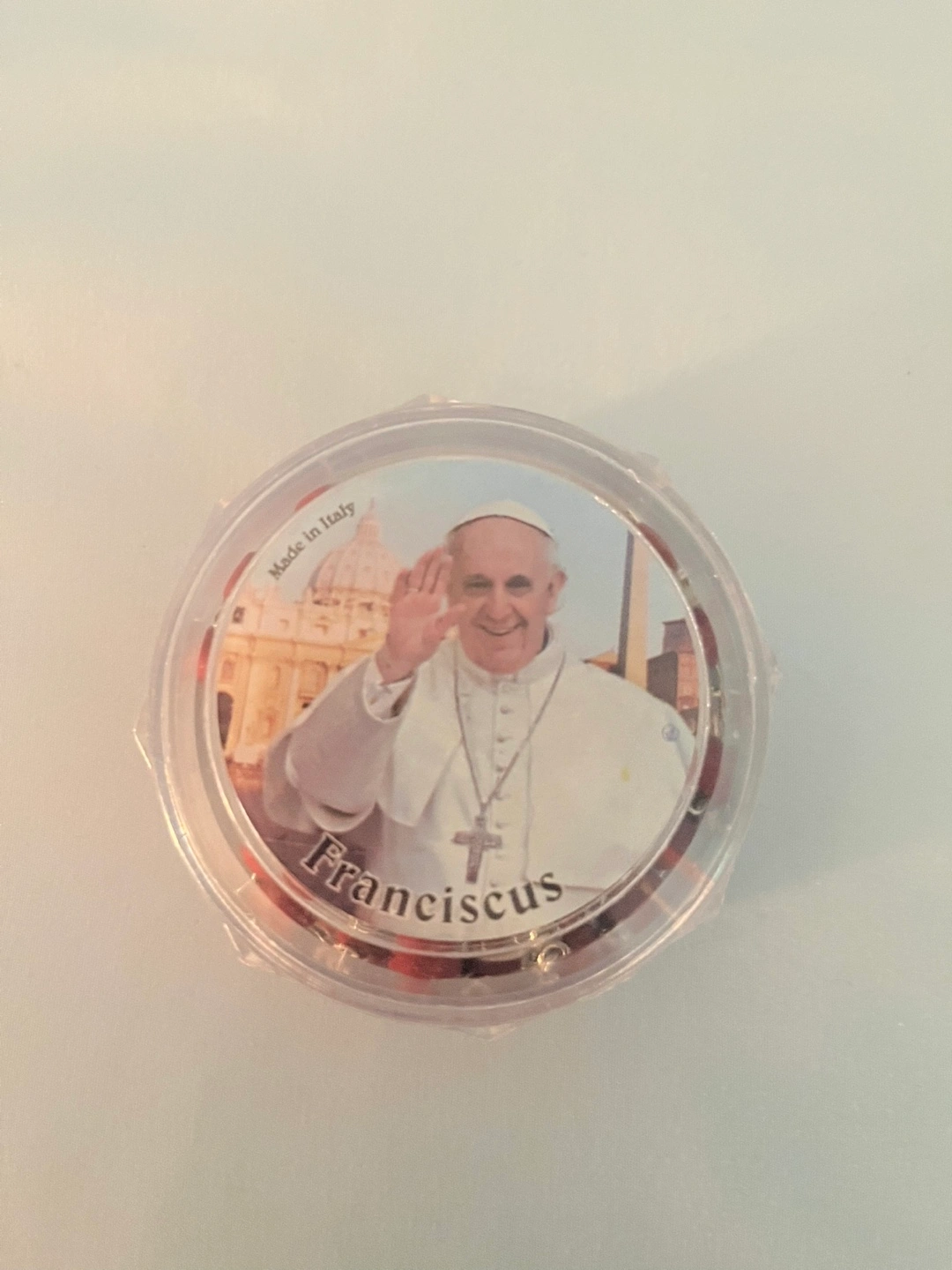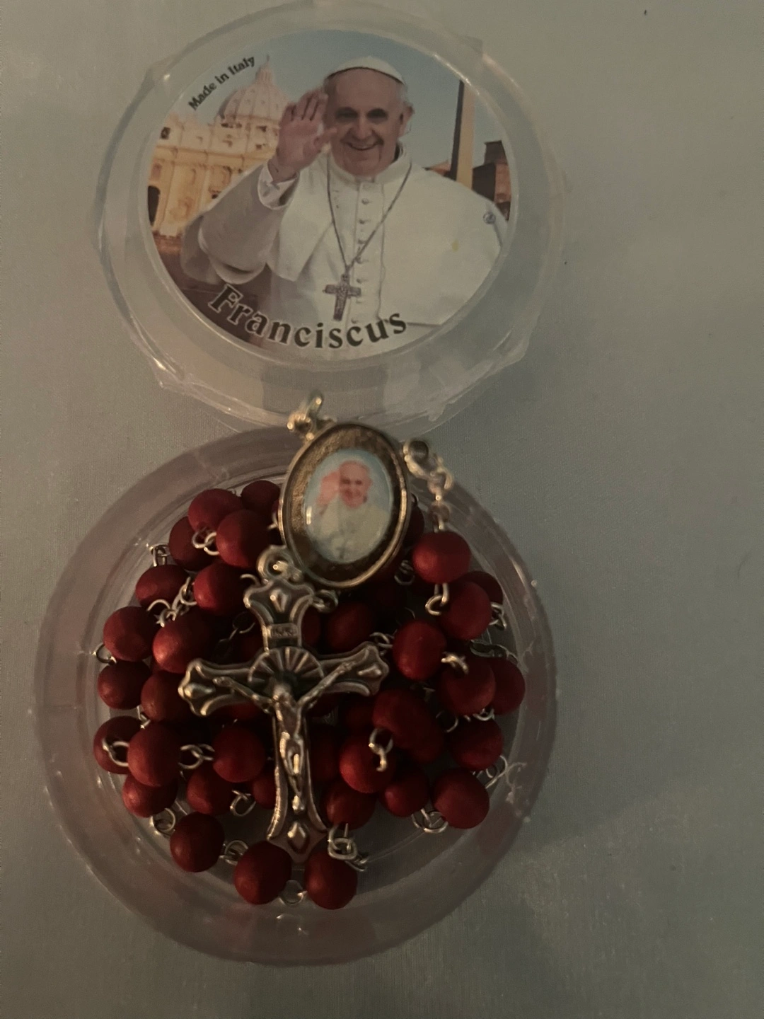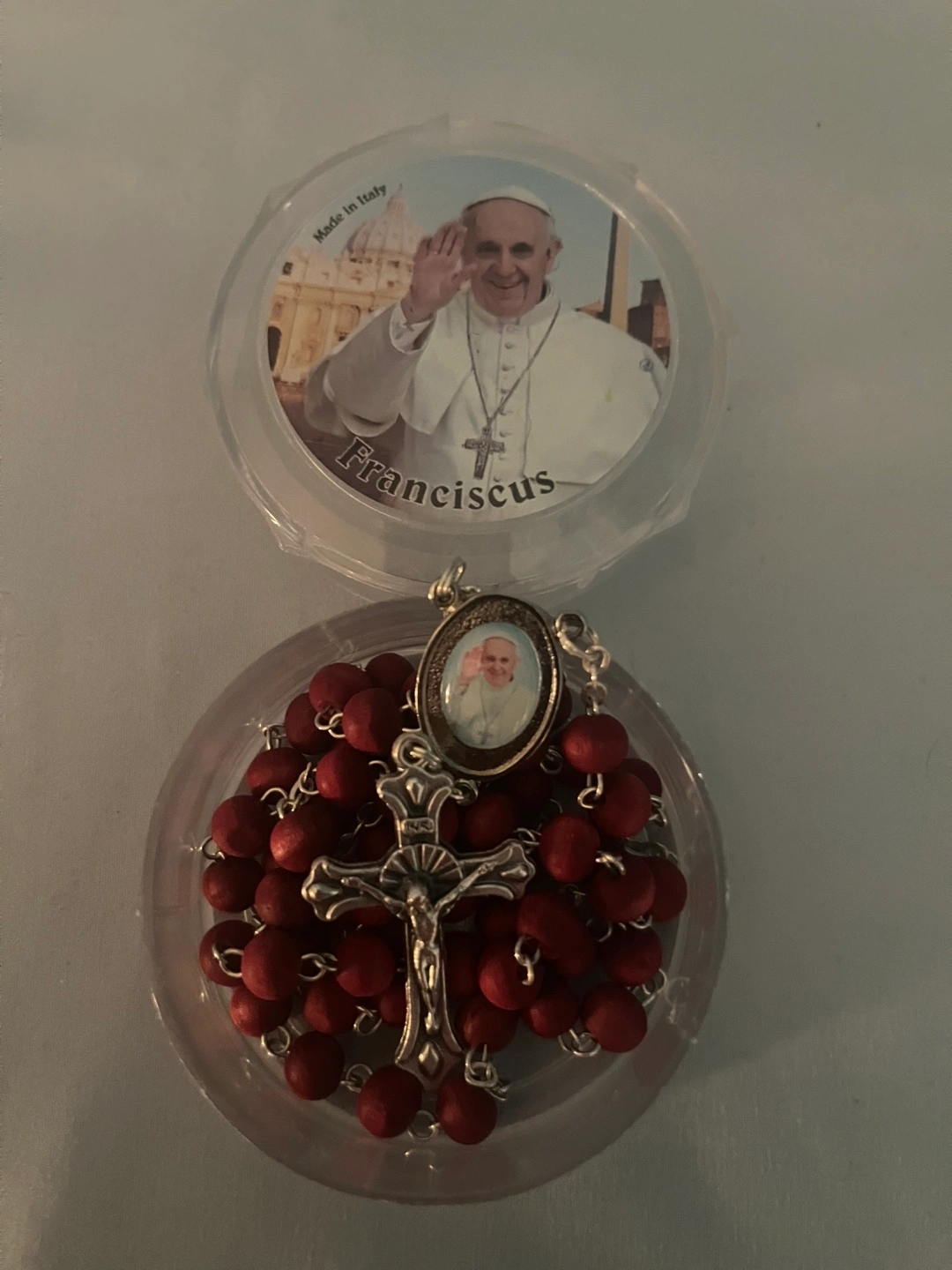 135Blessed scented Red wooden beads. Silver crucifix and centerpiece. Comes in a clear plastic case with a picture of Pope Francis. Made in Italy.