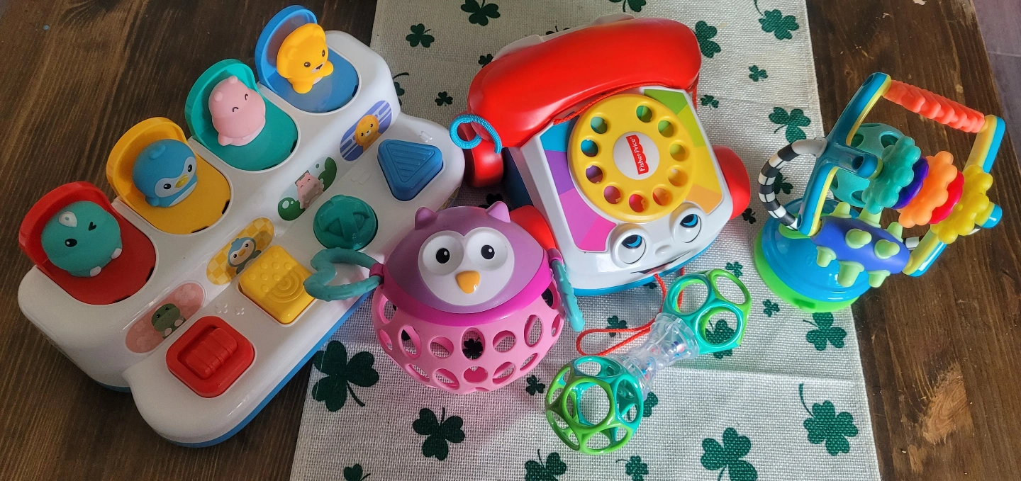 5 adorable baby toy bundle. Includes a Nuby and Oball toy, a phone toy, spinny toy with suction cup and a pop-up toy. Great for sensory development and fun playtime.