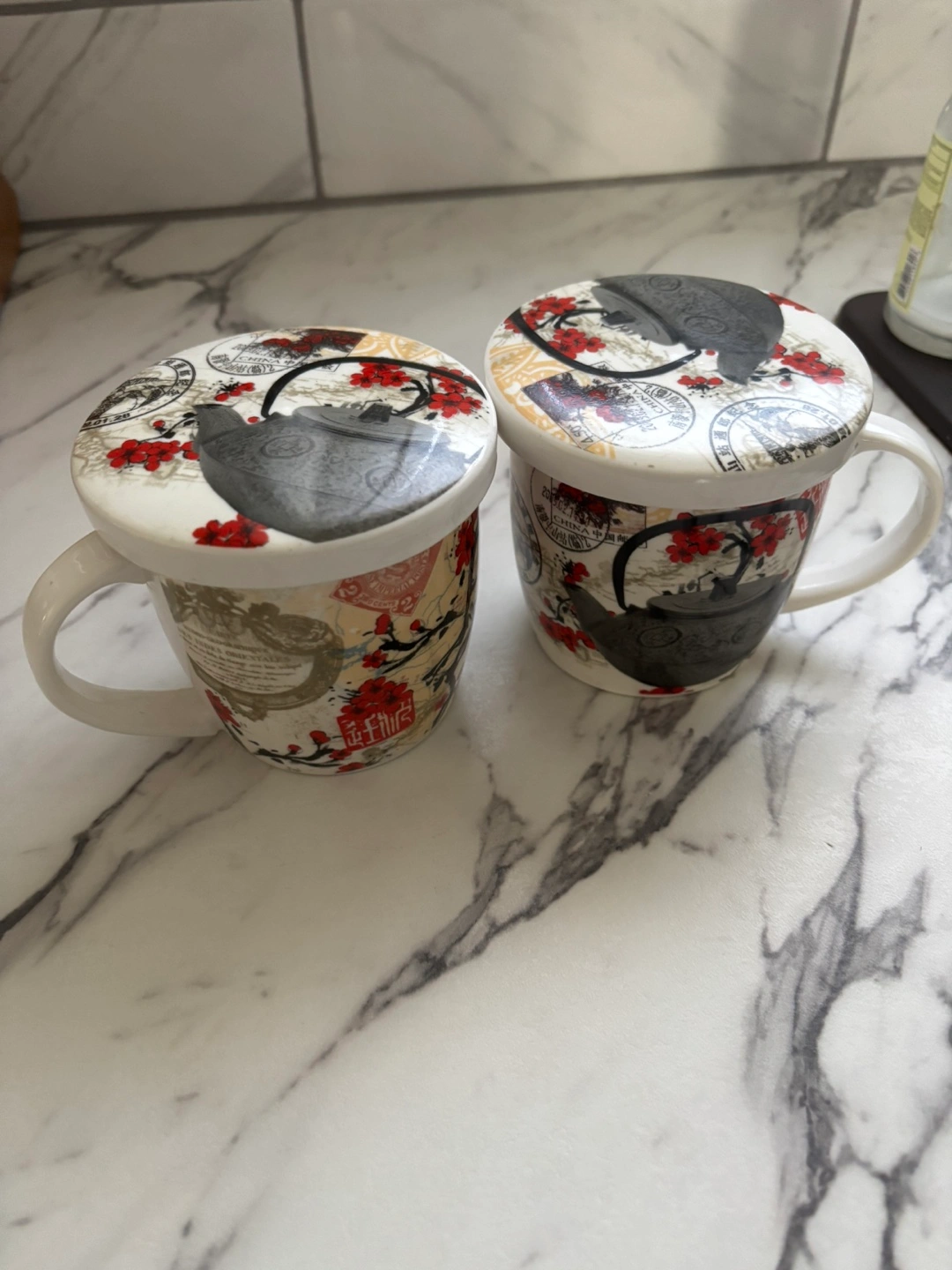 Two ceramic tea mugs. Features built-in infusers and matching lids. Floral and postage stamp design. Perfect for loose leaf tea.