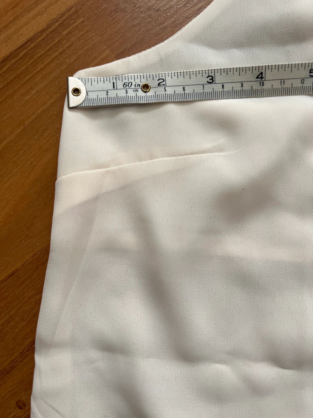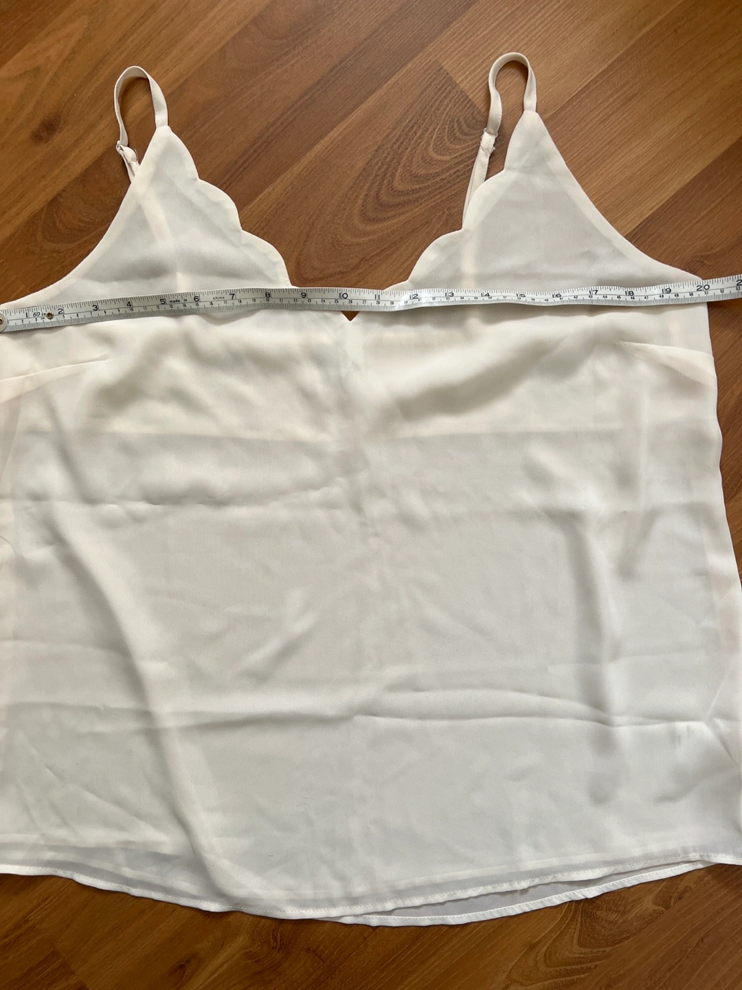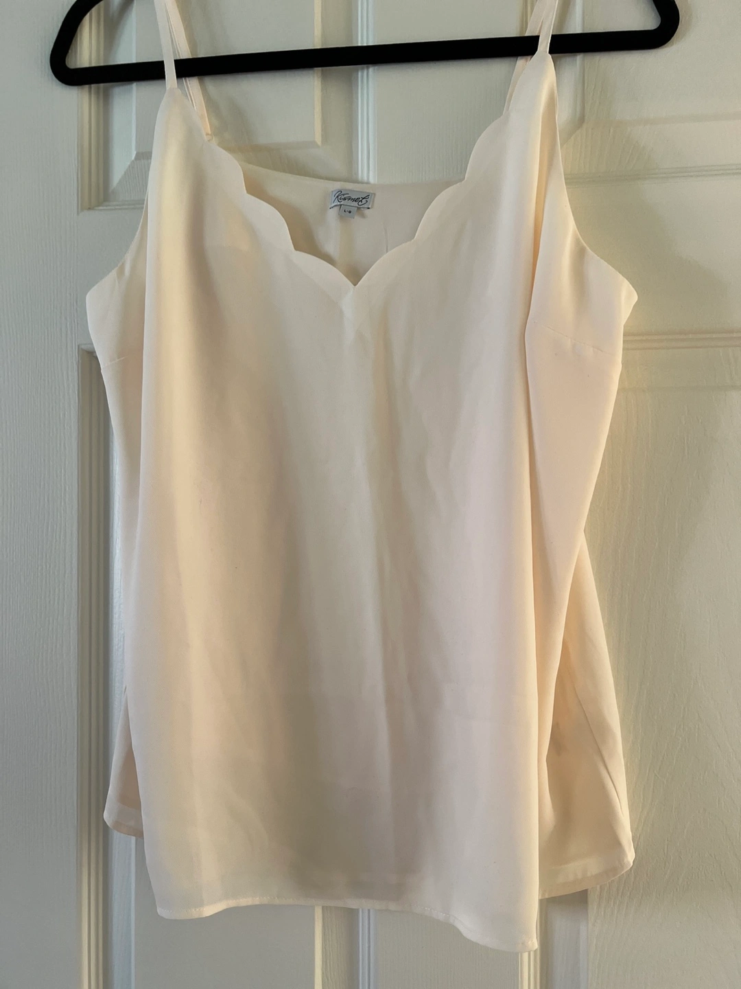 Cream-coloured sleeveless top. Scalloped neckline. Lightweight material. Size large/grande. Made in China This Kismet tank top features a soft cream color and a relaxed, flowy fit. The scalloped V-neckline adds a touch of elegance, while the lightweight fabric ensures comfort and style. It has adjustable straps. Barely worn 100% Polyester Pit to pit 20” Size Large Smoke free home Pick up near Glenanna Road and Hwy 2