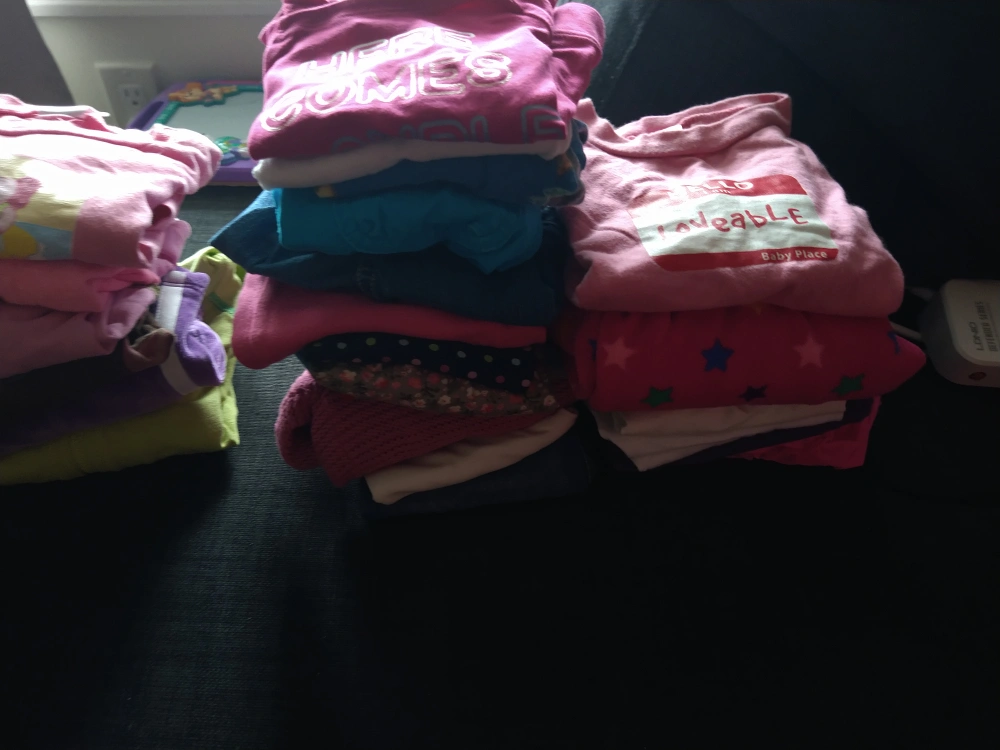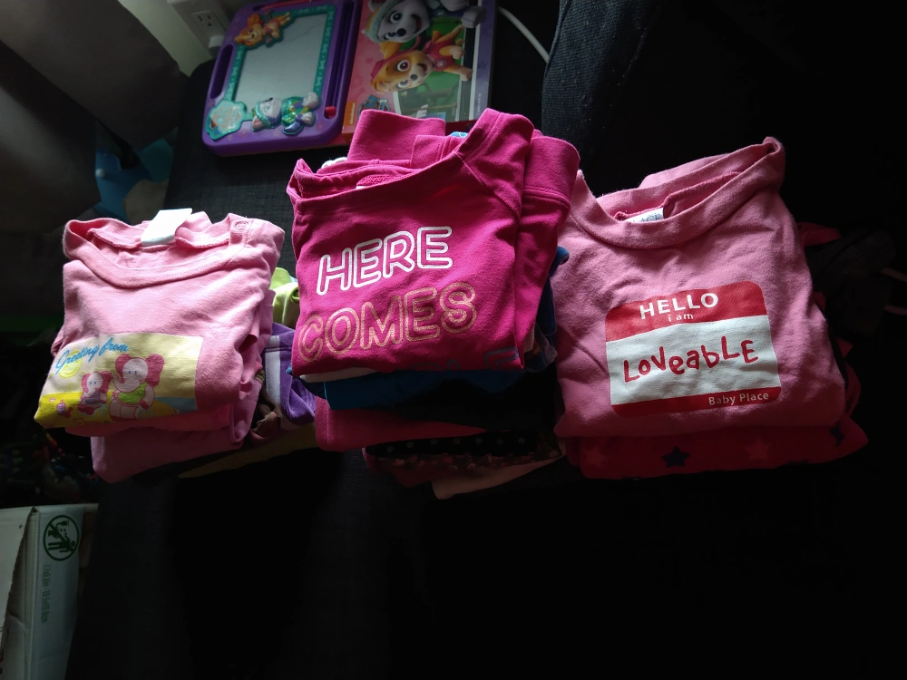 581Large bundle of toddler girls' clothes . Various colours and designs. Sizes approximately 24m-2T Includes several pink shirts with fun graphics. Some shirts feature polka dots and stars. Great for everyday wear or layering.