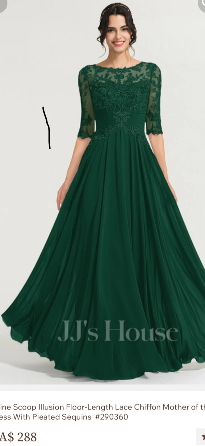 Elegant floor-length gown. Features lace bodice, chiffon skirt, and three-quarter sleeves. Pleated sequins. Scoop neckline. Brand new