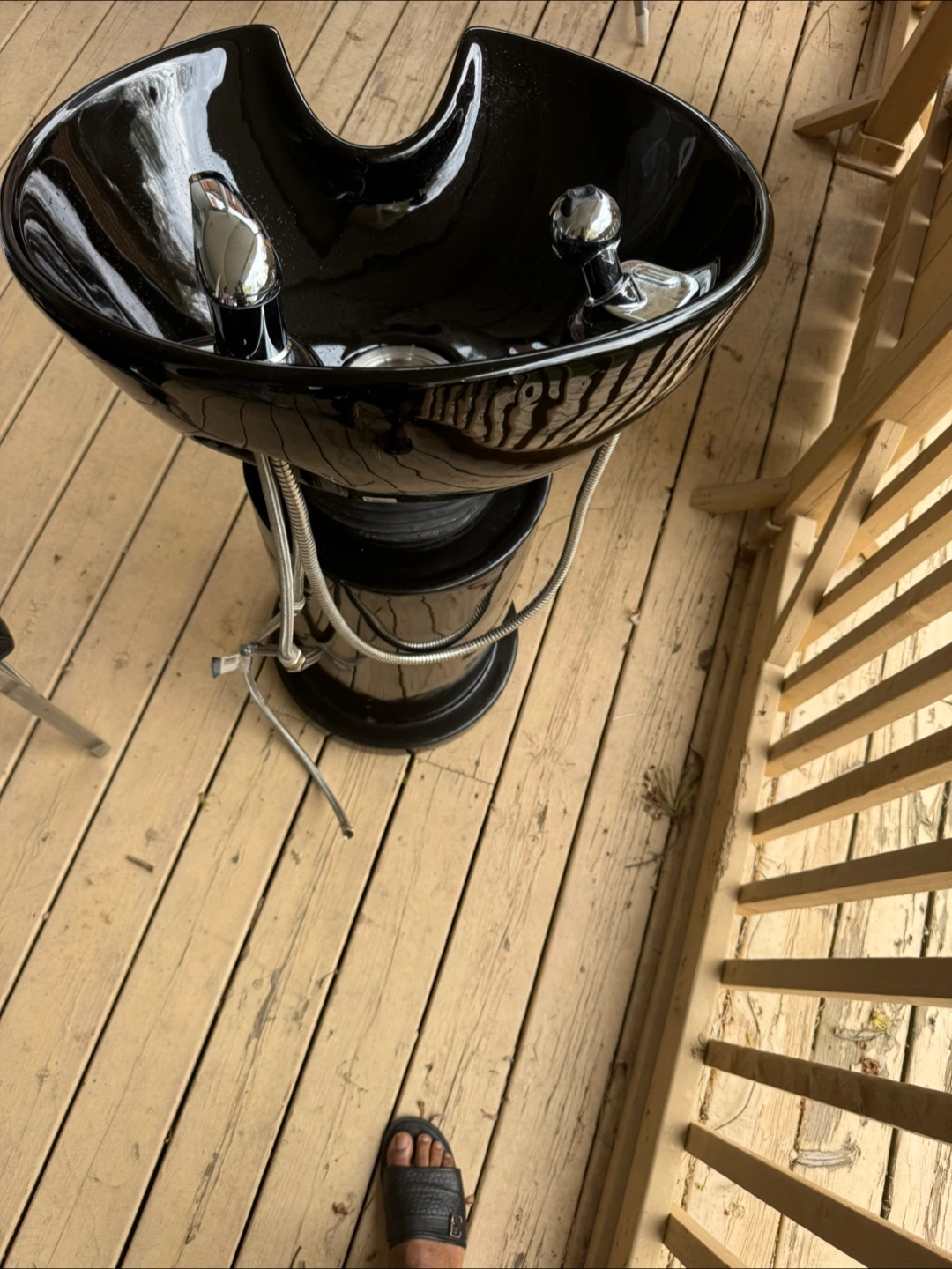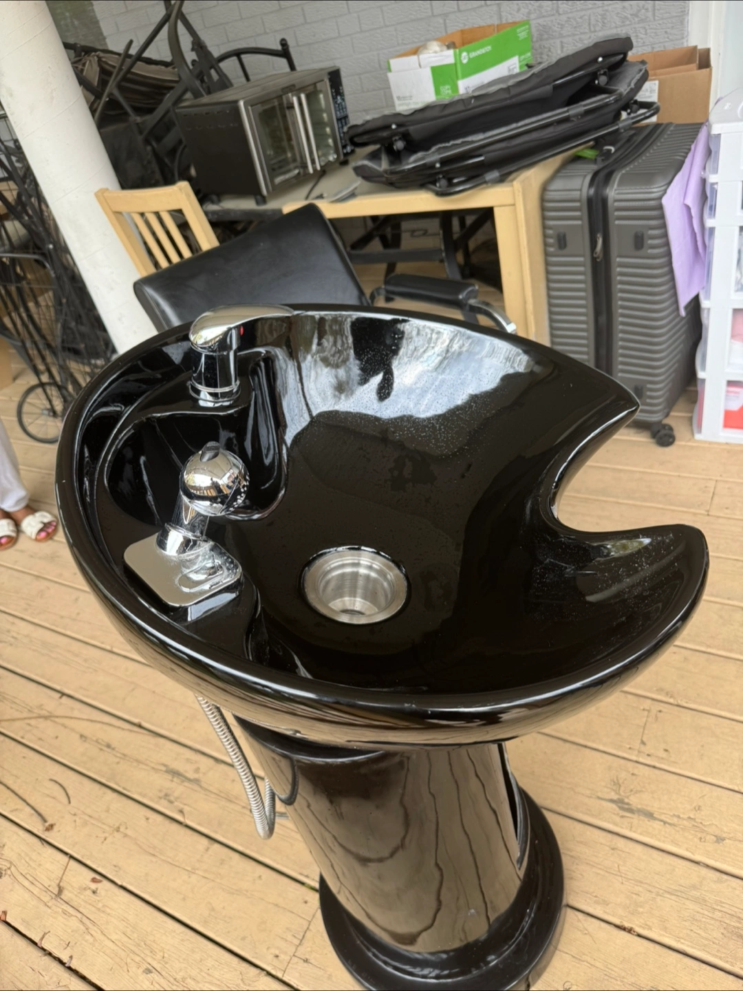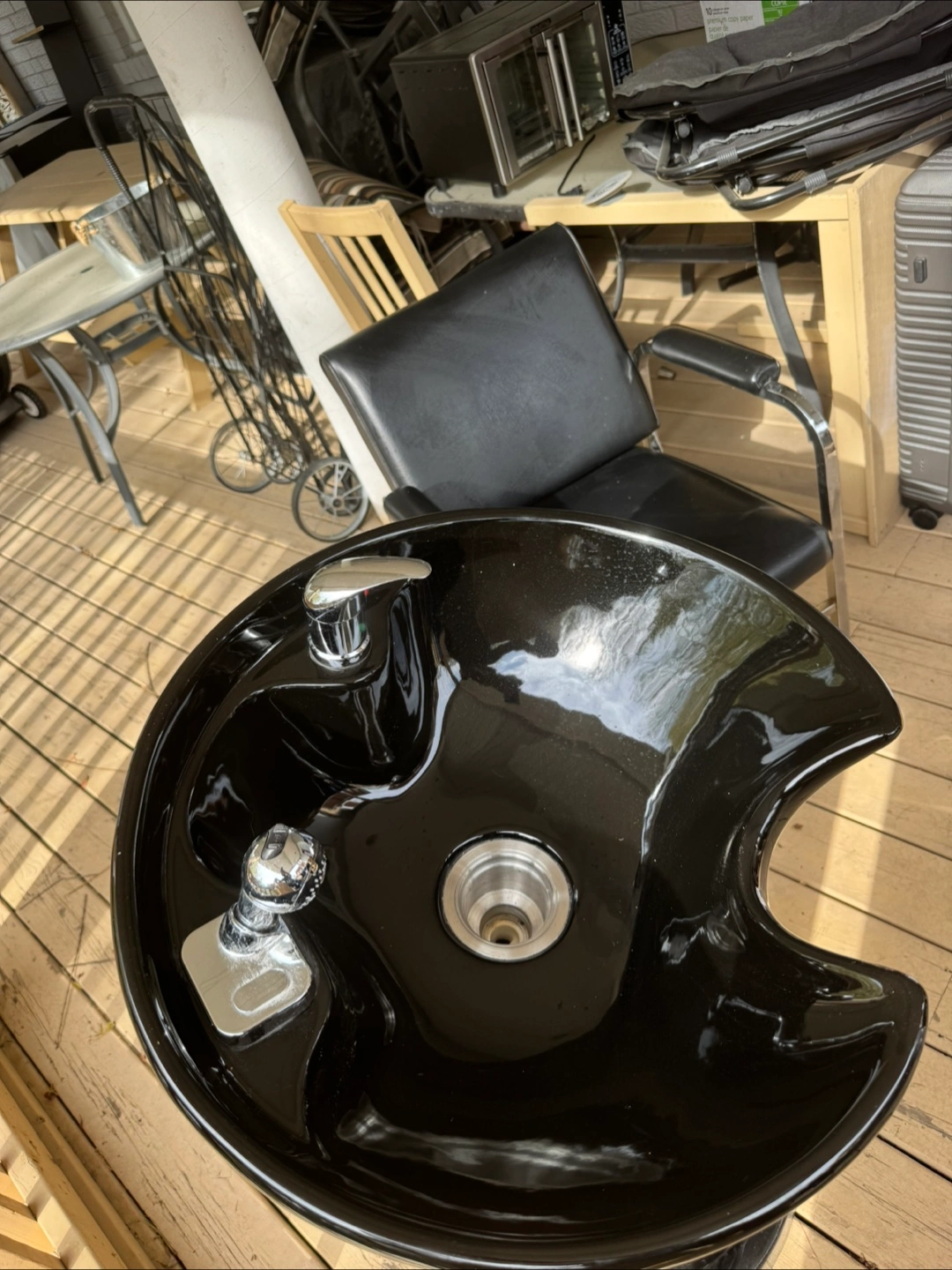 Black pedestal hair washing sink with recycling chair . Both going for 120 and if you can pick up today or tomorrow morning … will let it go for 100 . Price is firm . Moving sales