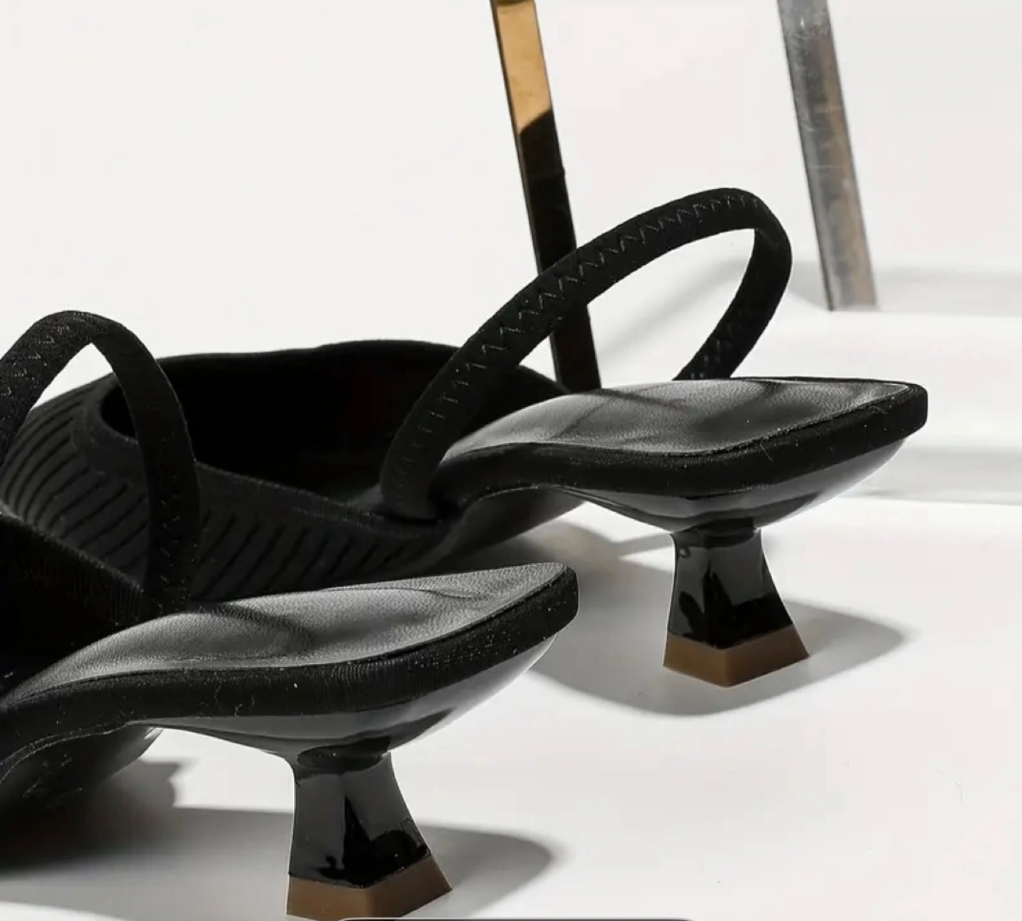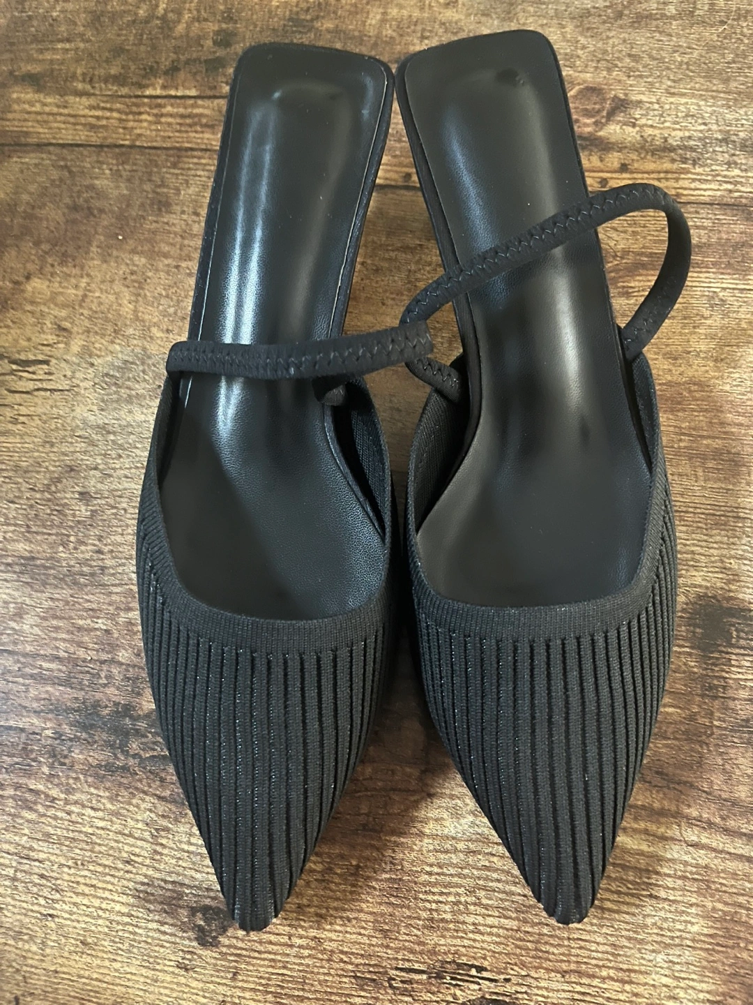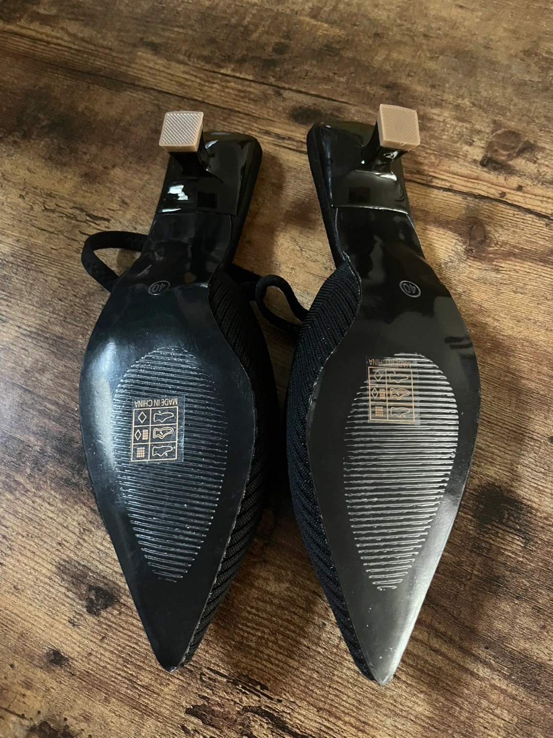 Pair of black slingback kitten heels. Knitted fabric upper, rubber sole. Pointed toe. Low heel. New in box.
