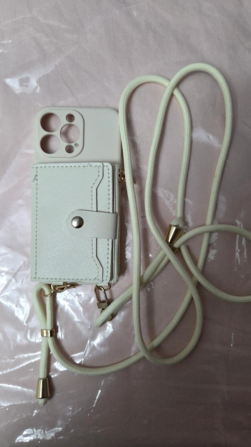 Two phone cases included. One black case features a fluffy dog graphic. The other is an off-white case with a built-in wallet and neck strap. Both compatible with iPhone 13 Pro.