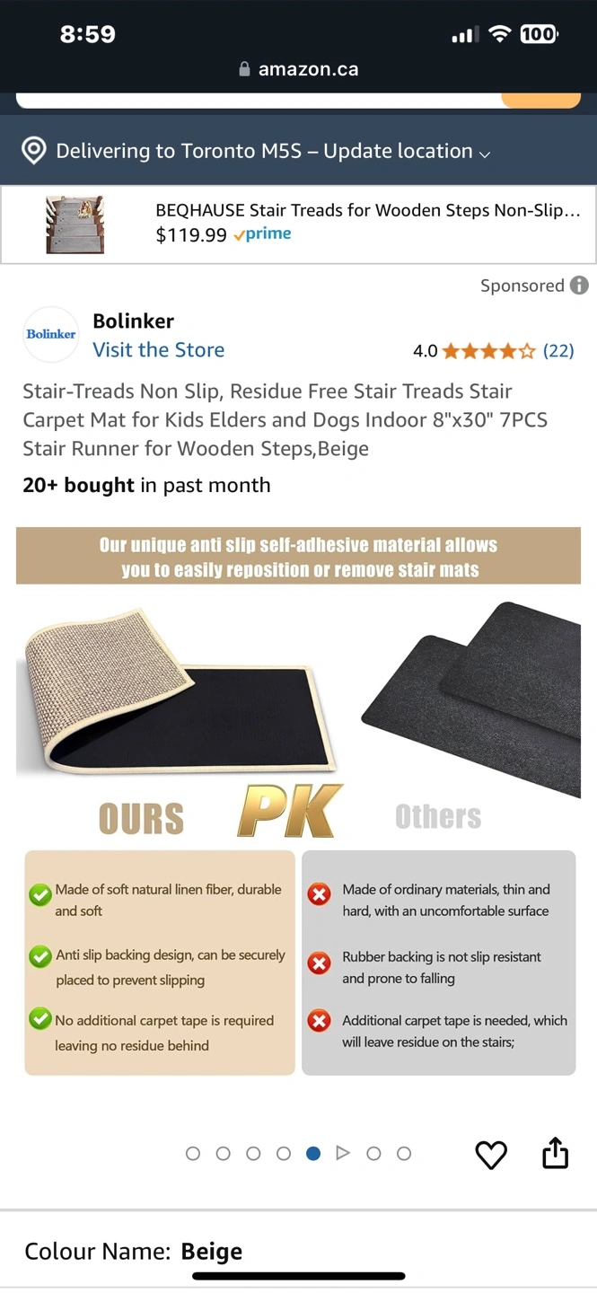 Used stair treads. Beige colour. Anti-slip. Some minor wear and tear visible. Please check photos. Used tape to connect together to create a small carpet area and after removing the tape it caused some wear/tear. Minor. Pick up Dundas and Spadina.