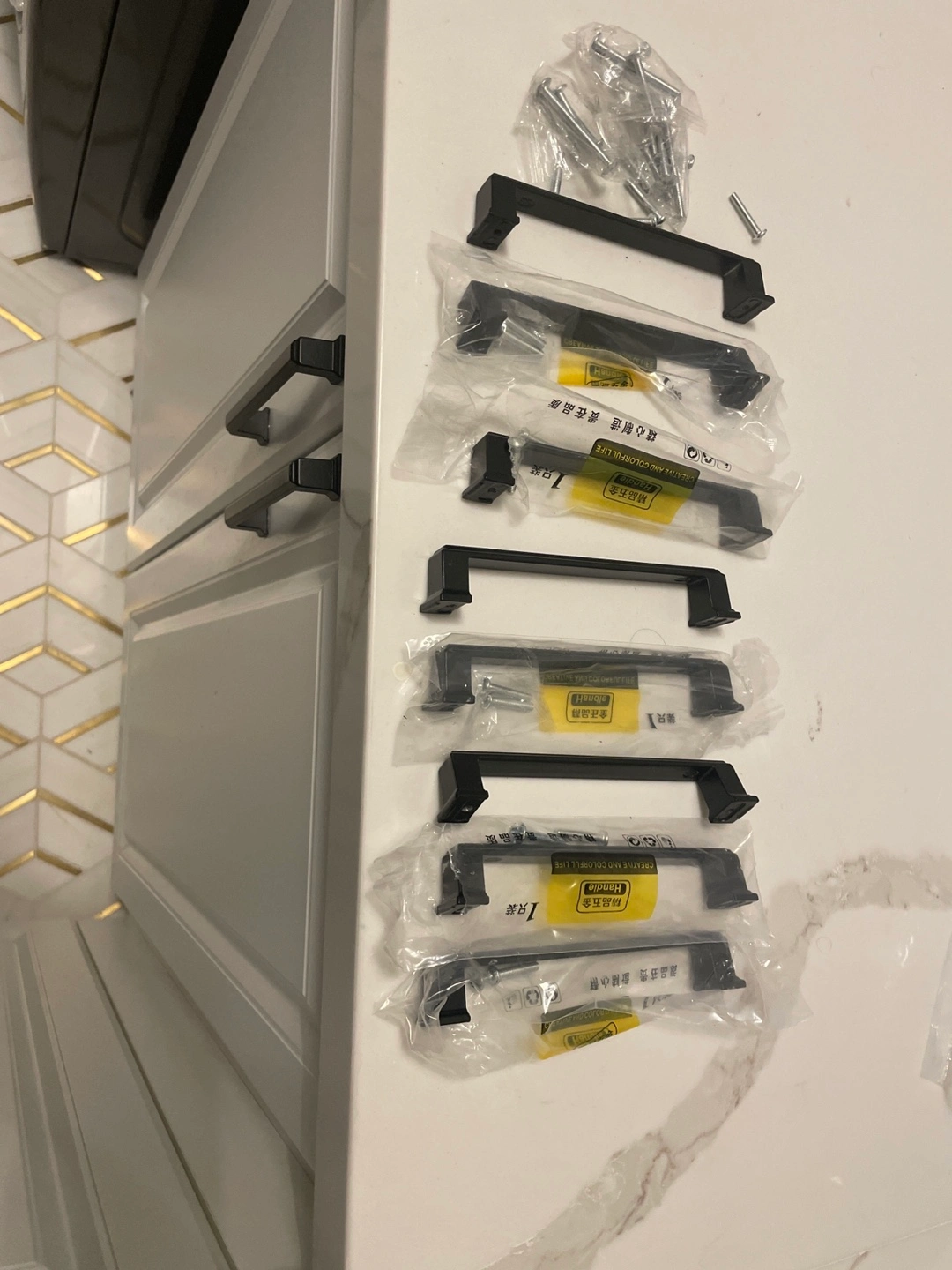 8 matte black cabinet pulls. New in packaging. Includes mounting hardware. Various sizes available. Each $3 Total:$24