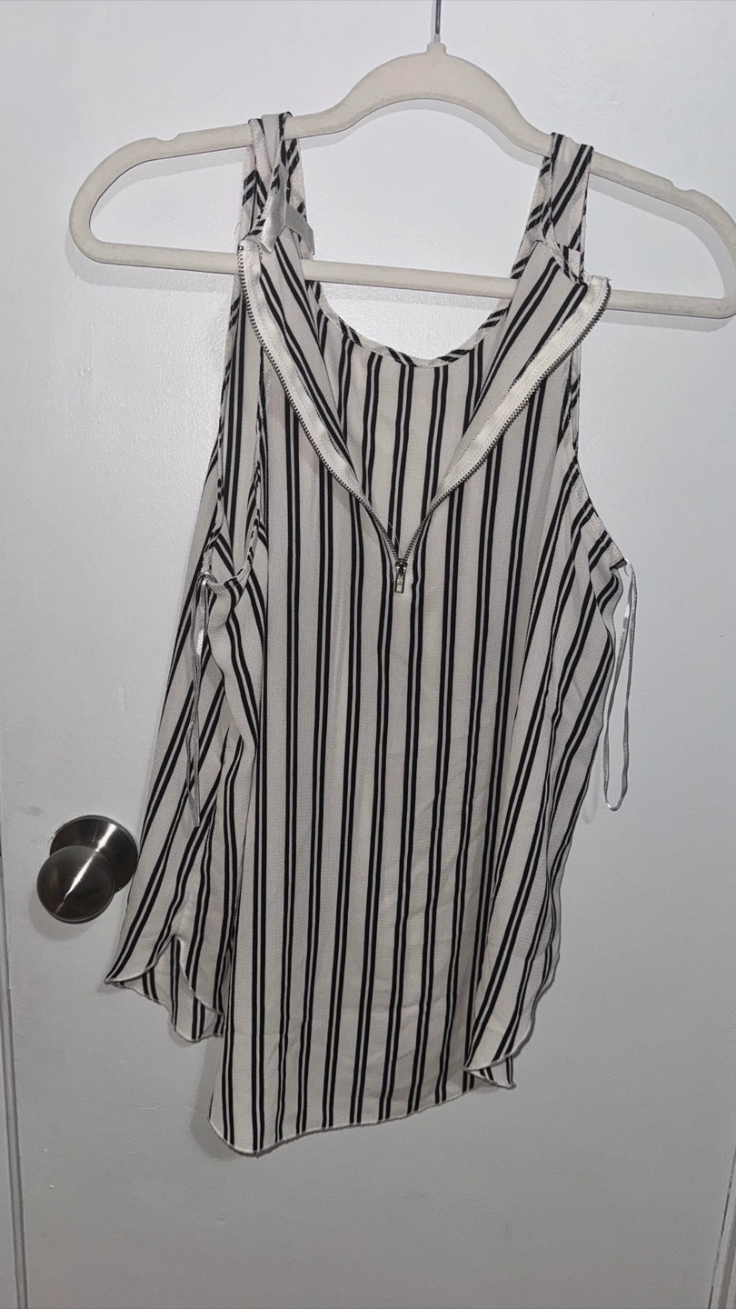 Stylish sleeveless top. Black and white vertical stripes. Features a zipper closure. Lightweight fabric. Great for summer.