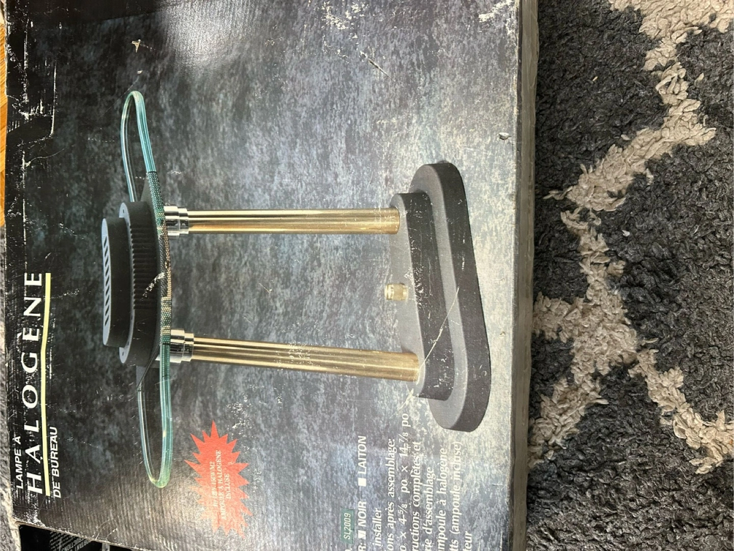 New, never used vintage halogen desk lamp. Glass top, metal base. Comes in original packaging. Features a sleek, minimalist design.