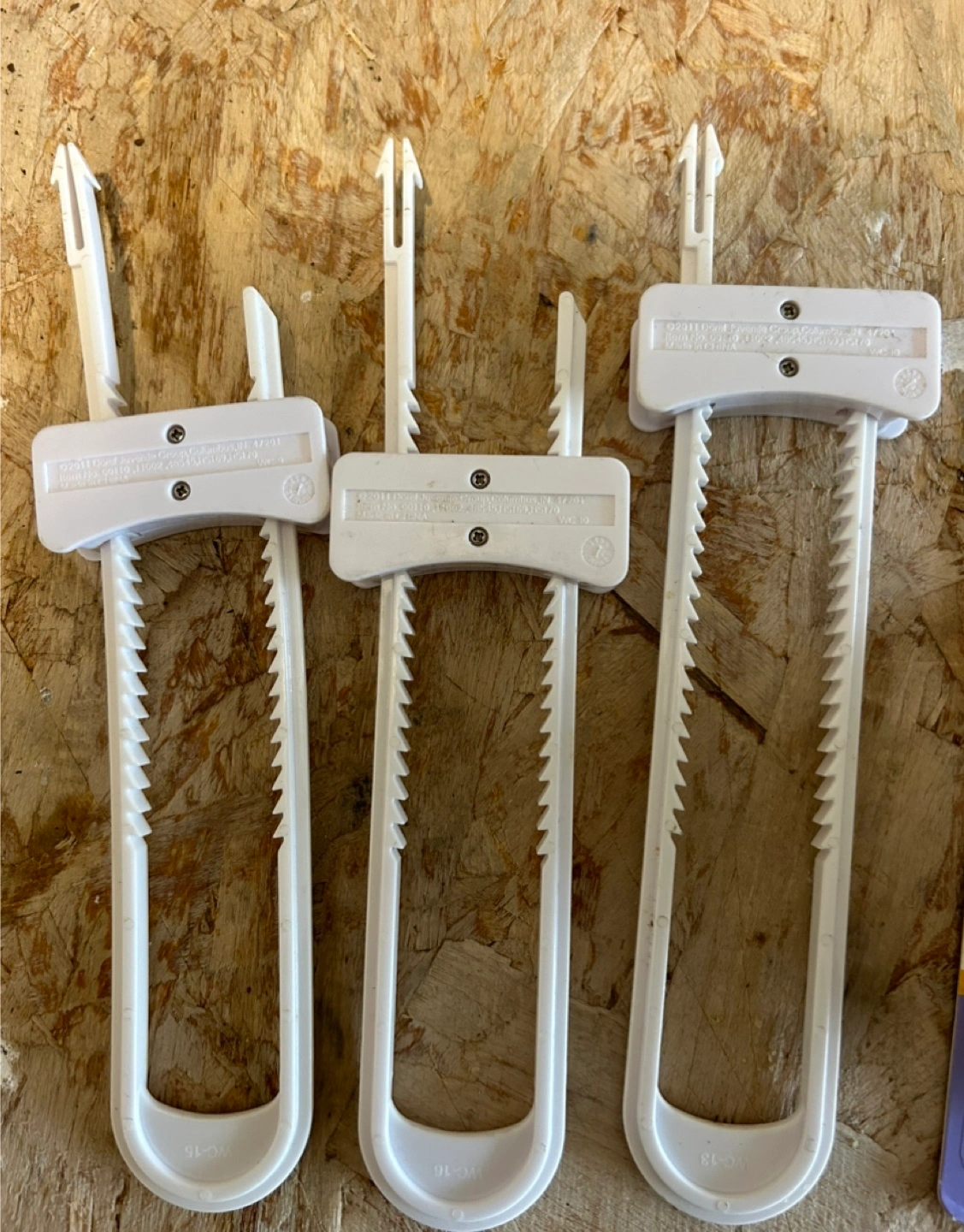 Set of twelve white plastic cabinet and drawer latches plus three door latches.