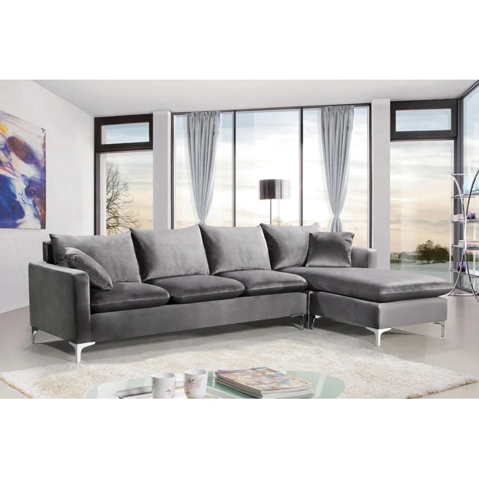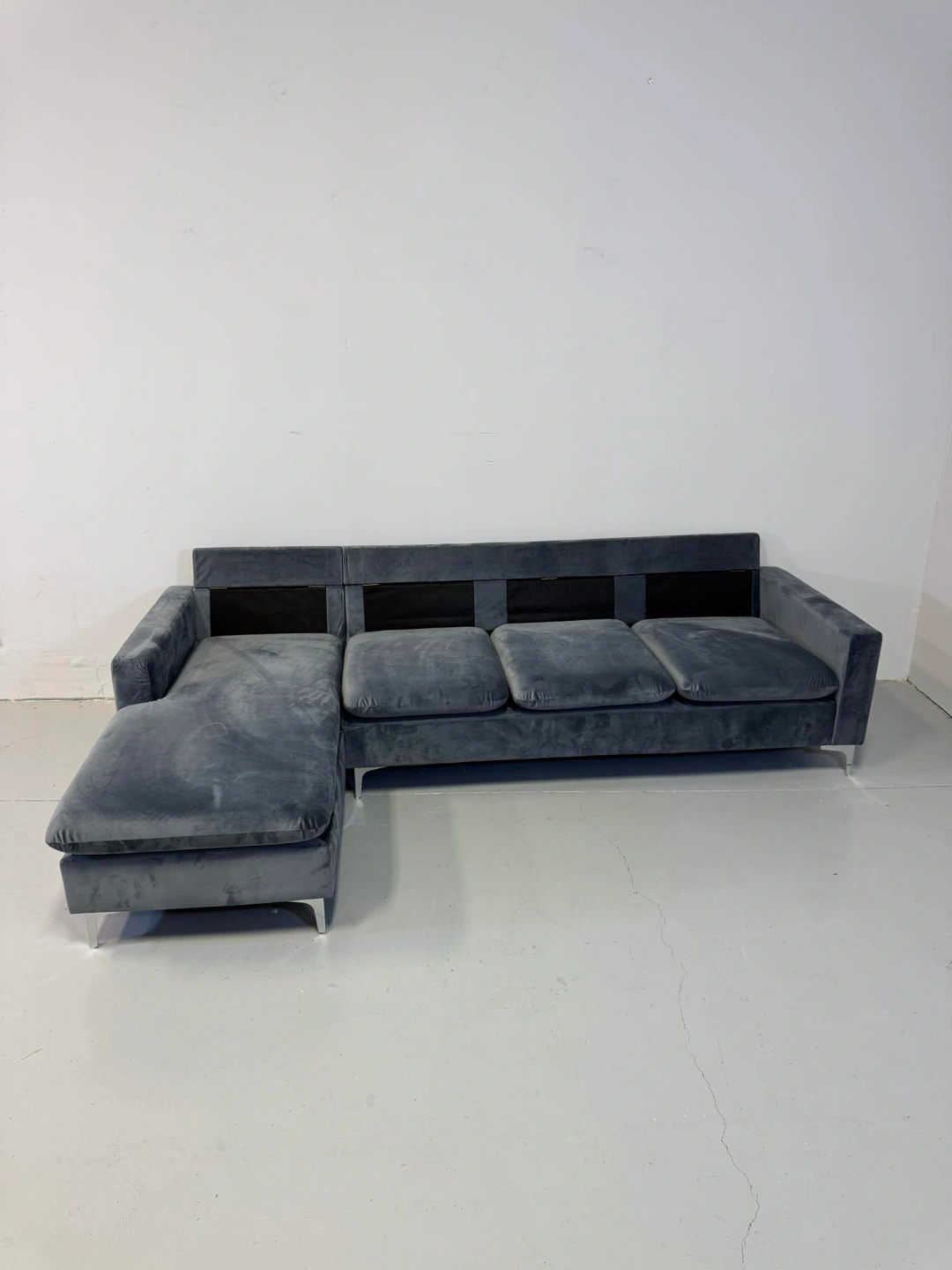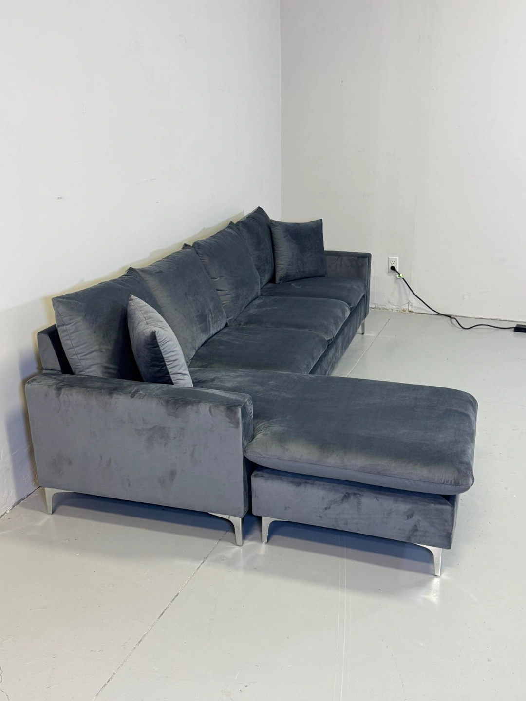 Modern grey velvet sectional sofa. Features a chaise lounge and silver legs. Includes several plush cushions. Comfortable and stylish addition to any living room.