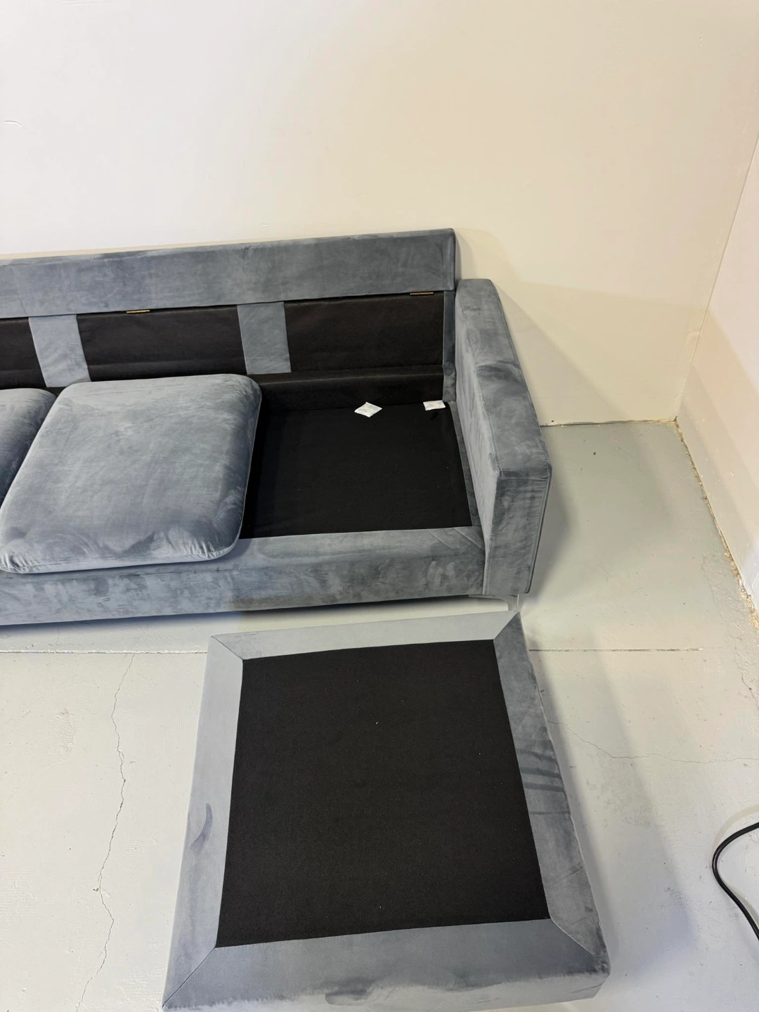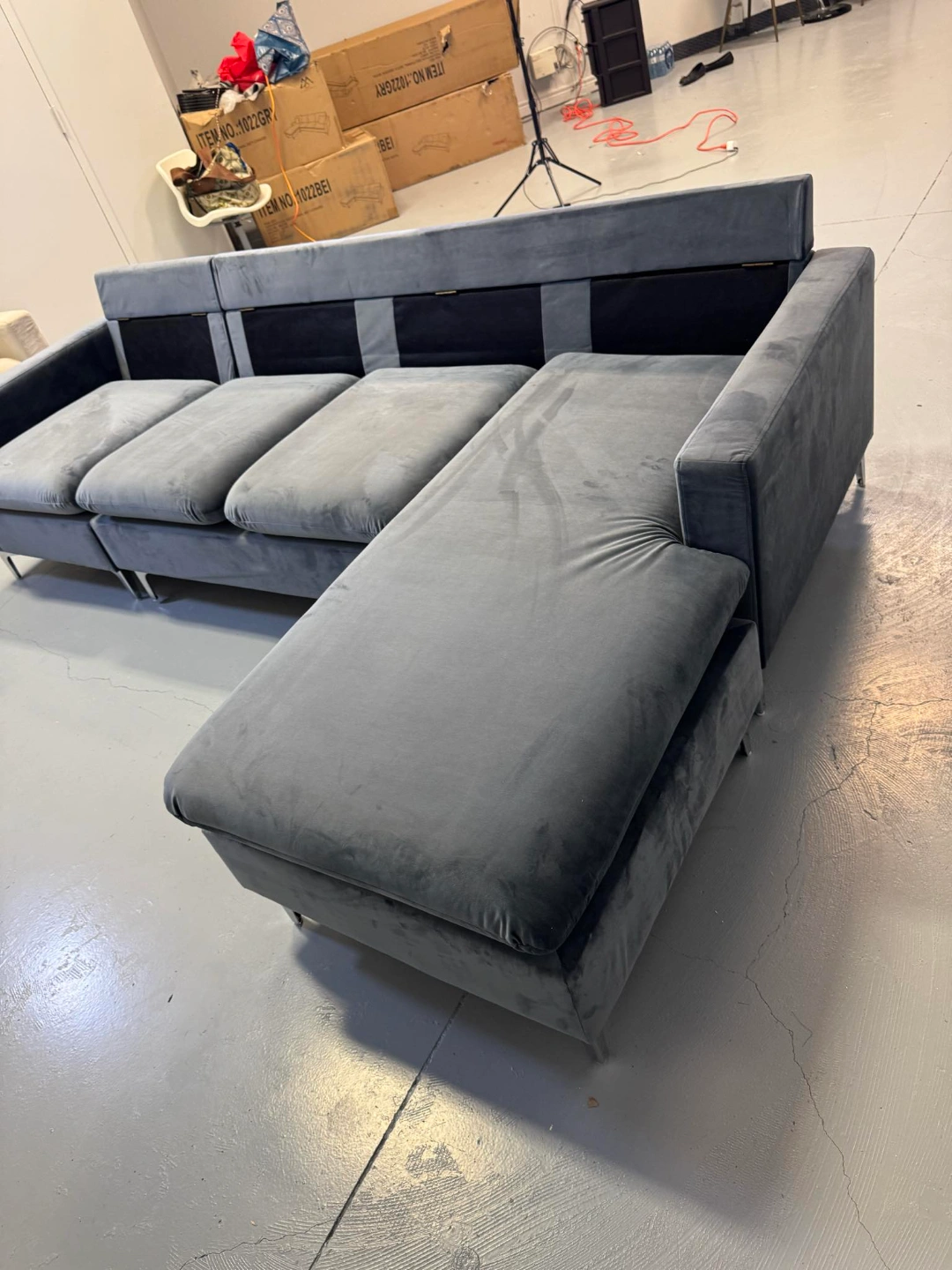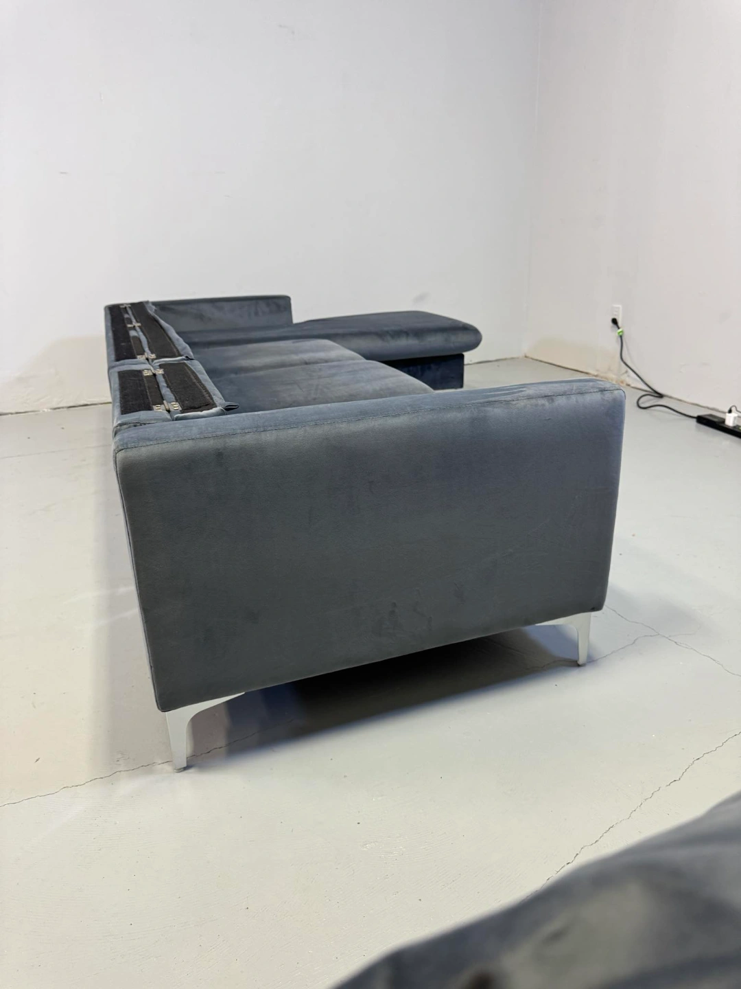 Modern grey velvet sectional sofa. Features a chaise lounge and silver legs. Includes several plush cushions. Comfortable and stylish addition to any living room.