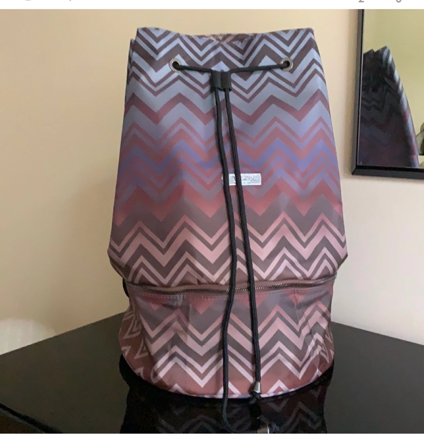 Unique chevron pattern. Drawstring closure. Zipper detail at bottom. Excellent for travel or everyday use.