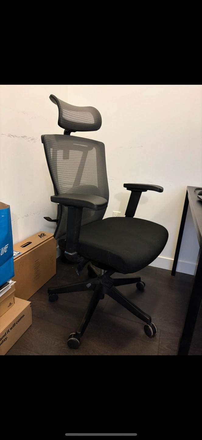 Ergonomic office chair. Mesh backrest and padded seat. Adjustable headrest. Five-star base with casters. Black and grey.