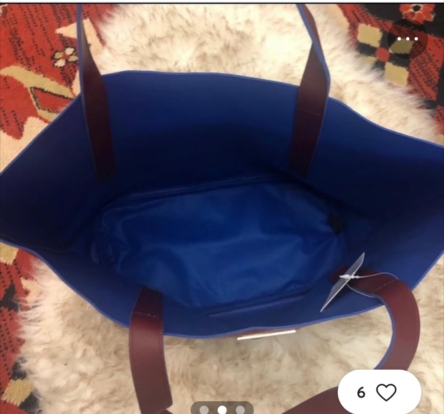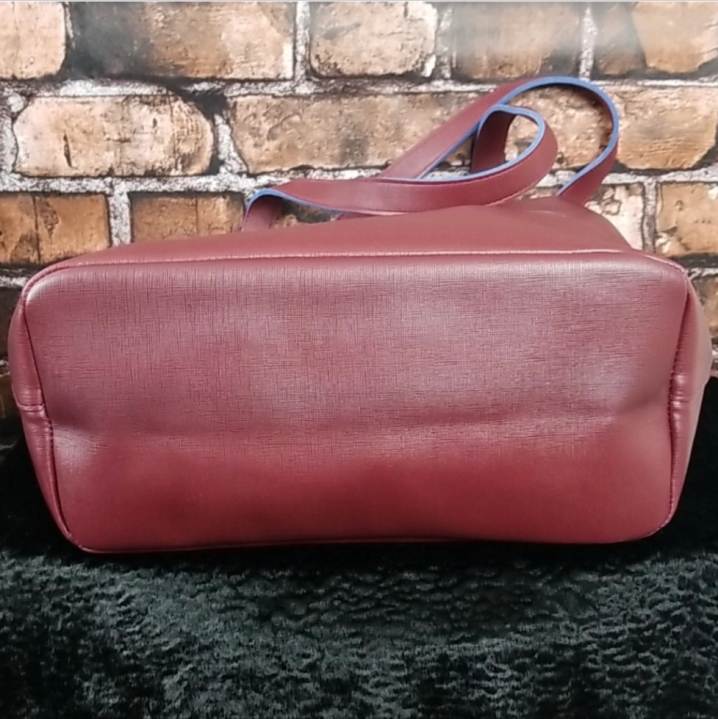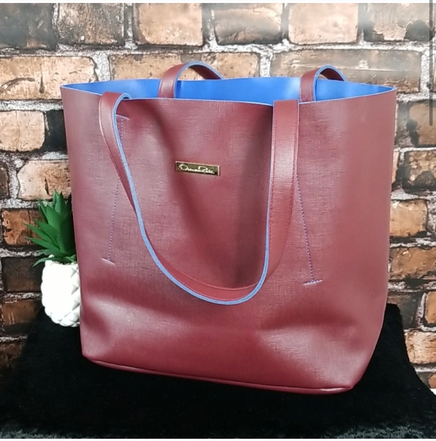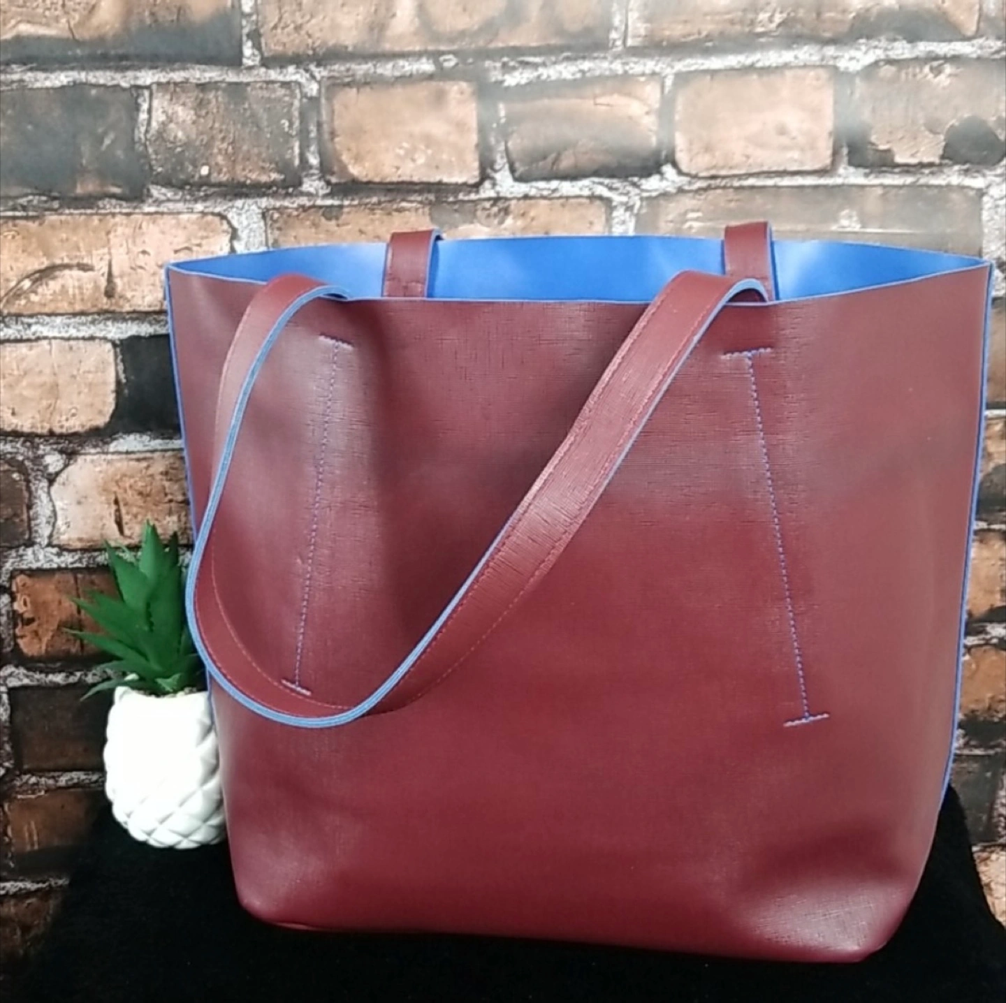 Large burgundy tote bag. Features blue stitching and accents on the straps. Faux leather.