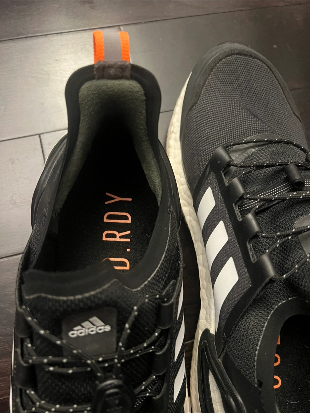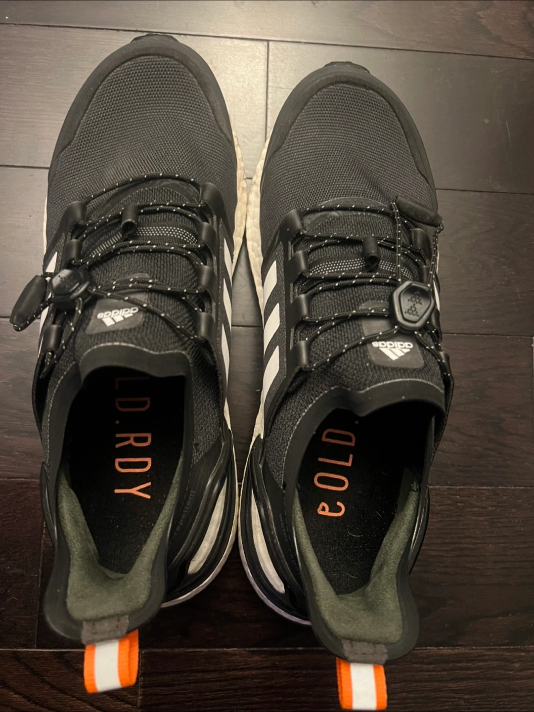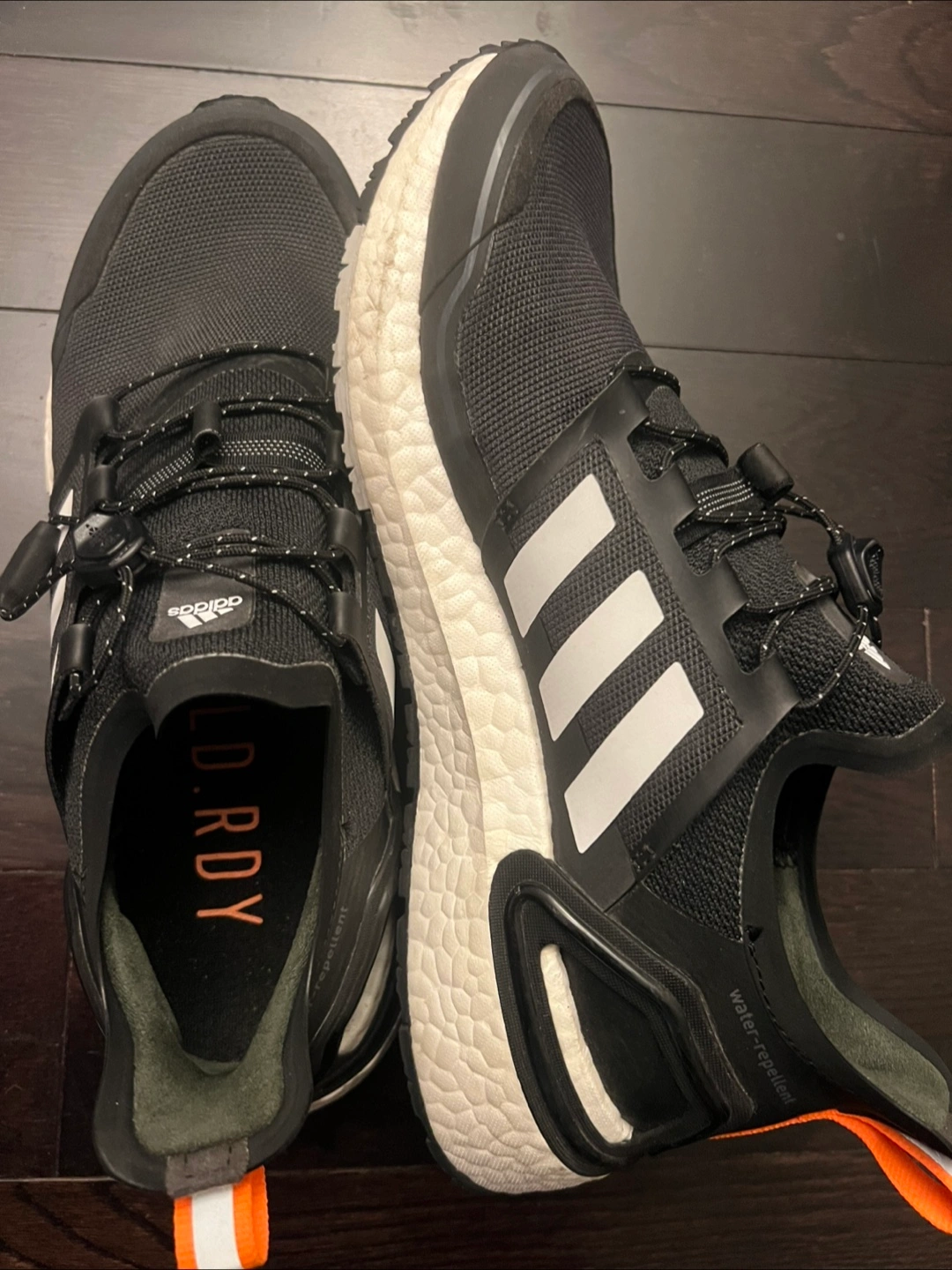 Water-repellent trail running shoes. Black with white accents. Boost midsole for cushioning. GORE-TEX technology for waterproofing. Unique lacing system. Comfortable fit. Only worn once, it’s pretty new without the tags.