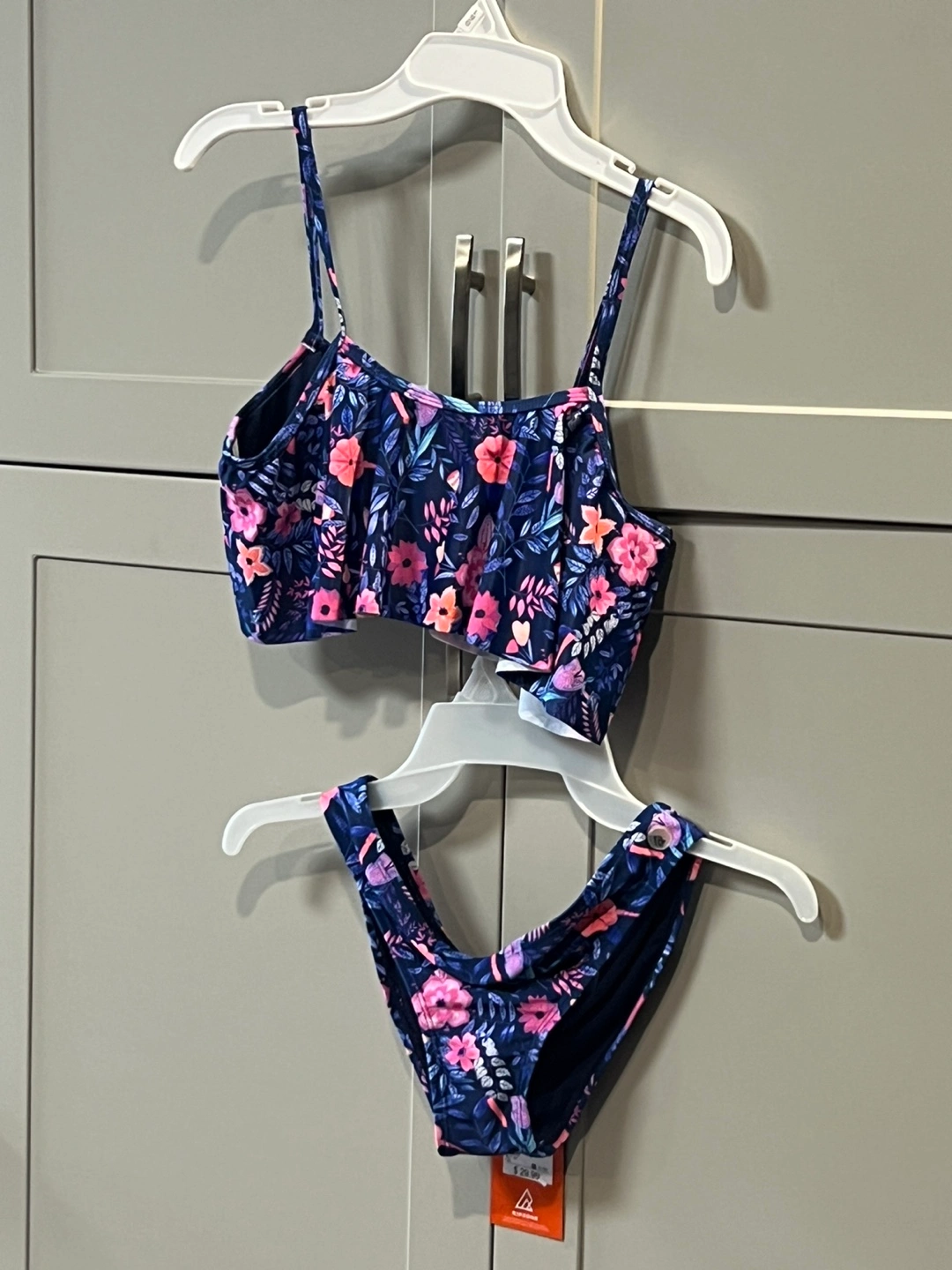 New with tag, RIPZONE ®️Floral print bikini bottom, & bikini top with flowy top-cover. Has a supportive dark, navy blue built in bra, with pink, purple, and teal flowers. So cute and rich in colour. Size is quite suitable for Ladies who are an XS-S, or Girls, Size 8 (14-16 Age). Never worn, protective stickers and tags still attached.